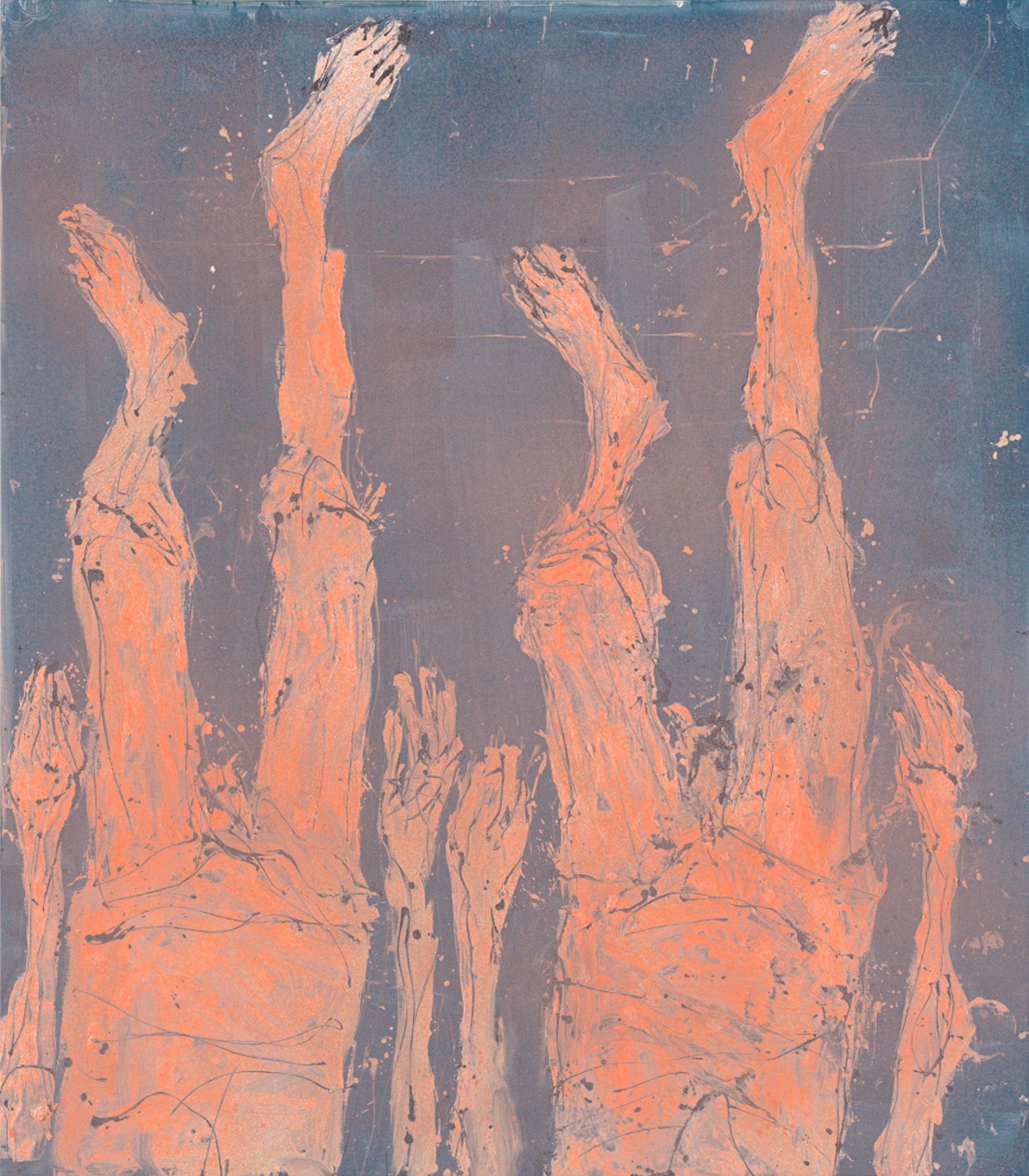Her resim yeni bir olayı anlatıyor; Baselitz belki altı ya da sekiz resimden oluşan küçük seriler ürettikten sonra başka bir olaya geçiyor. Üst katta benim “Hamsa eli” dediğim seriyi görebilirsiniz; Hamsa eli bir çeşit evrensel, hatta İslami bir sembol olsa da, Budizm ve benzeri başka inançlarda da kullanılıyor. Ama aynı zamanda Baselitz’in kendi bedenini, yani ellerini, bacaklarını temsil ediyor.