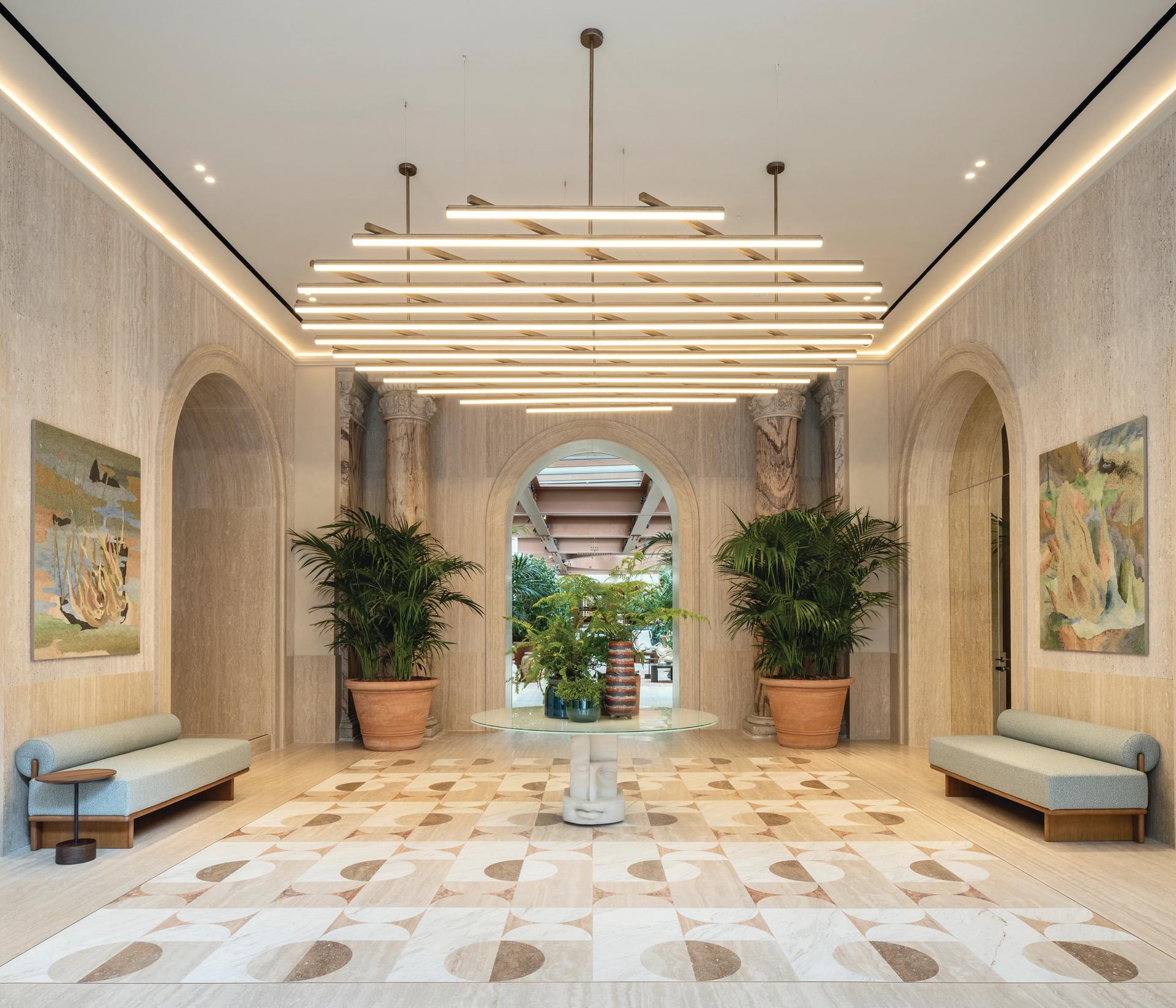 Otelin lobisi, Roma mimarisine özgü beş ana yuvarlak kemerle çevrili; bunlar, Antik Yunan ve Roma mimarisinin peristil denilen sütunlu avlularını andırıyor. Tasarımın her yerine serpiştirilmiş bitkiler, traverten demirbaşlar misafirleri karşılayan ilk doneler. Bitkilerle zenginleştirilmiş lobinin göbeğinde modern bir masa yer alıyor. Masanın altlığına çağdaş sanatçı Paolo Giardano’ya ait, tüm başlangıçların iki yüzünü temsil eden Antik Roma tanrısı İanus’un heykeli yerleştirilmiş. Geçmişi ve geleceği izleyen İanus’un bir yüzü tarihi Piazza San Marcello’ya, bir yüzü ise otelin galerisine bakıyor. Galerideki sanat eserleri geleceğin yenilikleriyle buluşan, klasisizmin etkisinde geçmişi kutlayan Six Senses projesinin bir simgesi.