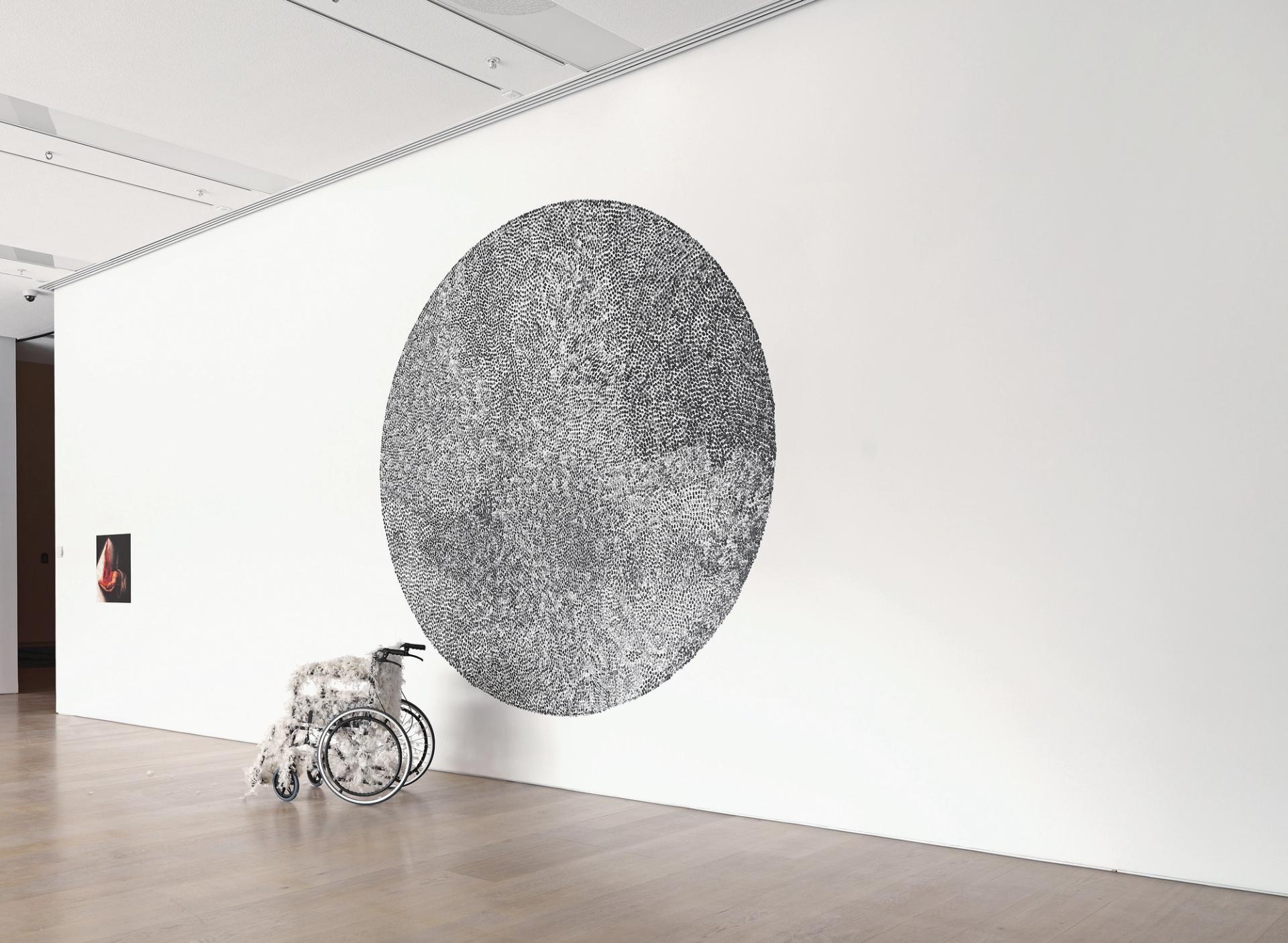 Sergide olay ufkundan kaçan, onun sıcak ve renkli çekim alanına kapılmayan tek şey bir duvarla serginin geri kalanından ayrılmış, yalıtık ve her şeye sırtını dönmüş duran beyaz kuş tüyleriyle kaplı tekerlekli iskemledir. Arka yüzeydeki siyah parmak izlerinden oluşan dairesel alanla oluşturduğu siyah-beyaz kompozisyon öndeki sergi alanıyla nazarî bir diyalektik kurar.