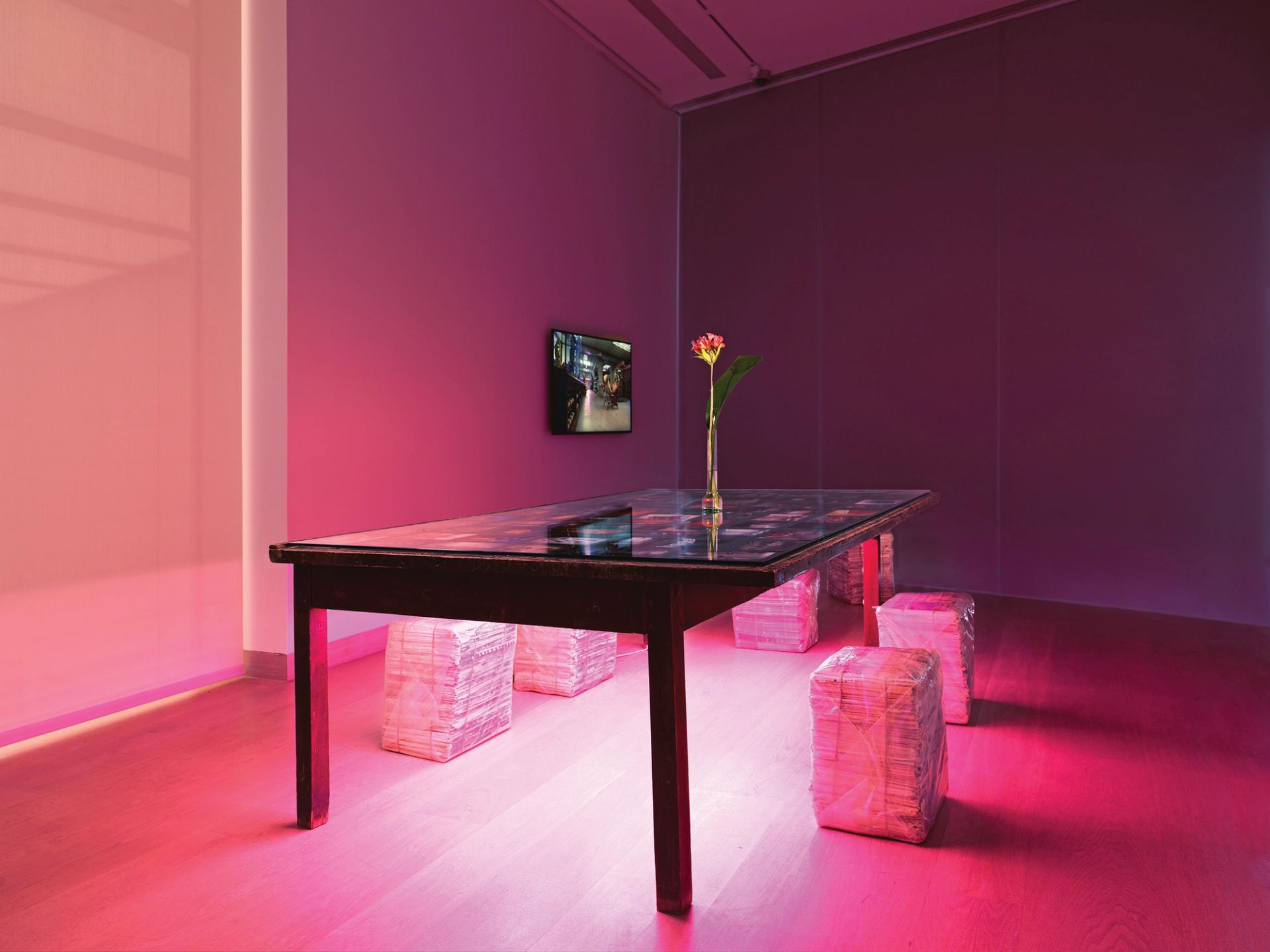 Sarkis, Karışık Retrospektif, 2001 Fotoğraflar, masa, floresan, gazete balyaları, vazo içinde çiçek. Masa: 119 x 240 x 76,5 cm Arter Koleksiyonu Fotoğraf: Hadiye Cangökçe