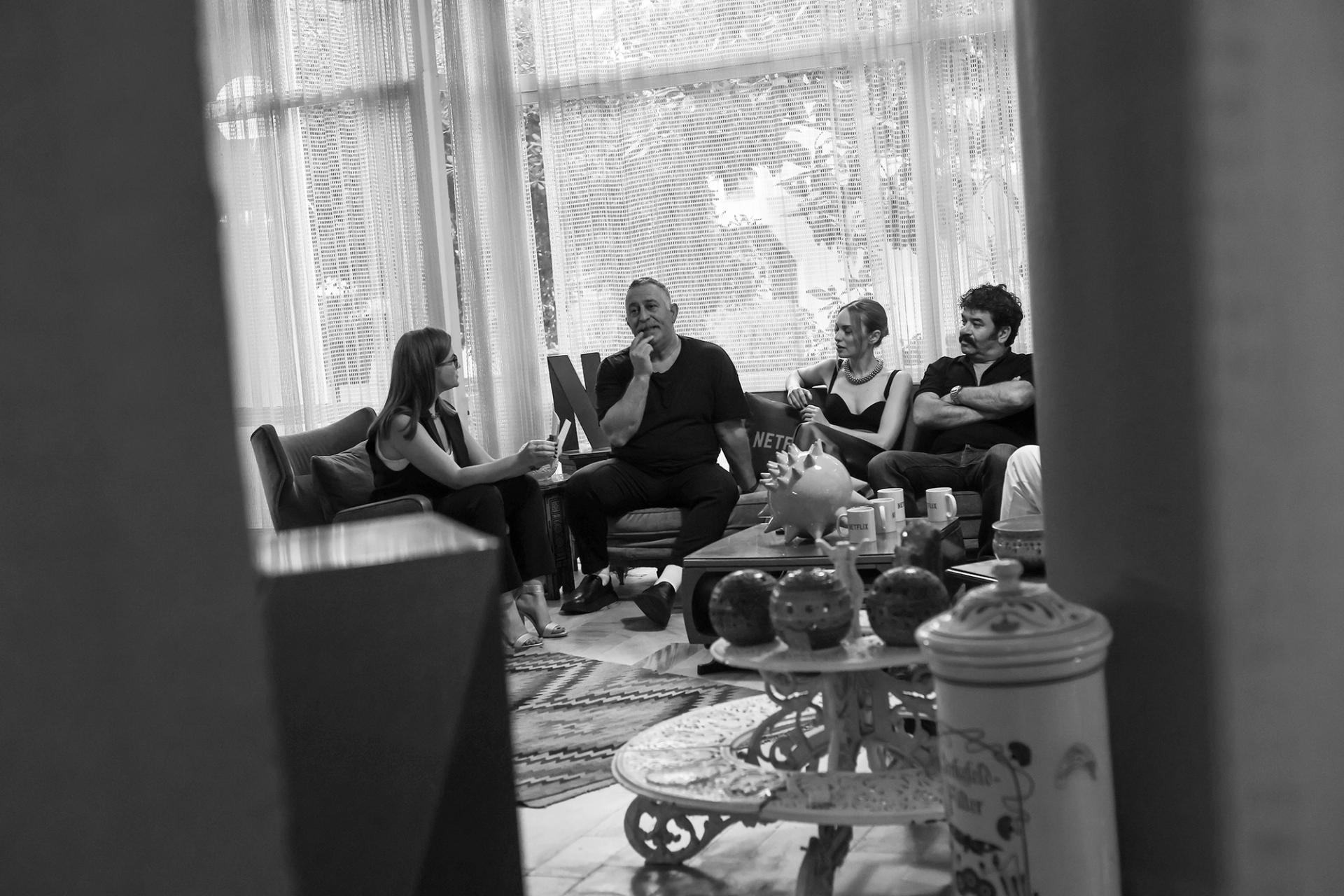 C.Y.: WhatsApp grubunun tabii ki etkisi var ama emin olun bizim WhatsApp grubu öyle şenlikli bir WhatsApp grubu değil, o başka bir grup. Bizim grupta mesela böyle teknik teknik… Mesela hiç çekilmemiş bir sahne atıyorsunuz, diyorsunuz ki, “Aşağıdaki Davut’la Ayzek arasındaki diyaloğu okur musun?” Böyle bir şey yazıyorum, Bülent’e atıyorum, “Çok güzel abi,” diyor. “Emin misin Bülent?” diyorum. “Eminim,” diyor.