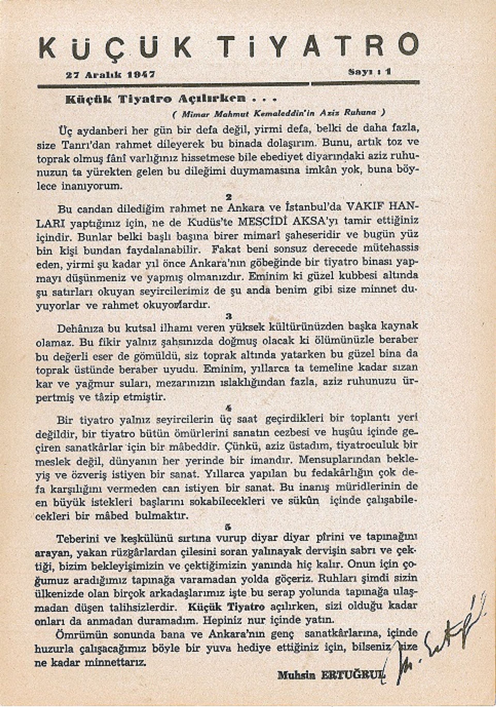 Ertuğrul, hemen çalışmalara başladı ve Atatürk’ün Ankara’ya gelişinin yıldönümü olan 27 Aralık 1949 günü binanın açılışı tamamlandı. Bir yerli temsille, Ahmet Kutsi Tecer’in Köşebaşı oyunuyla perdelerini açtı. Muhsin Ertuğrul o gün için çıkardıkları özel dergiye bir giriş yazısı yazdı, binanın mimarı Kemalletin Bey’e hitaben yazılmış bir mektuptu bu...