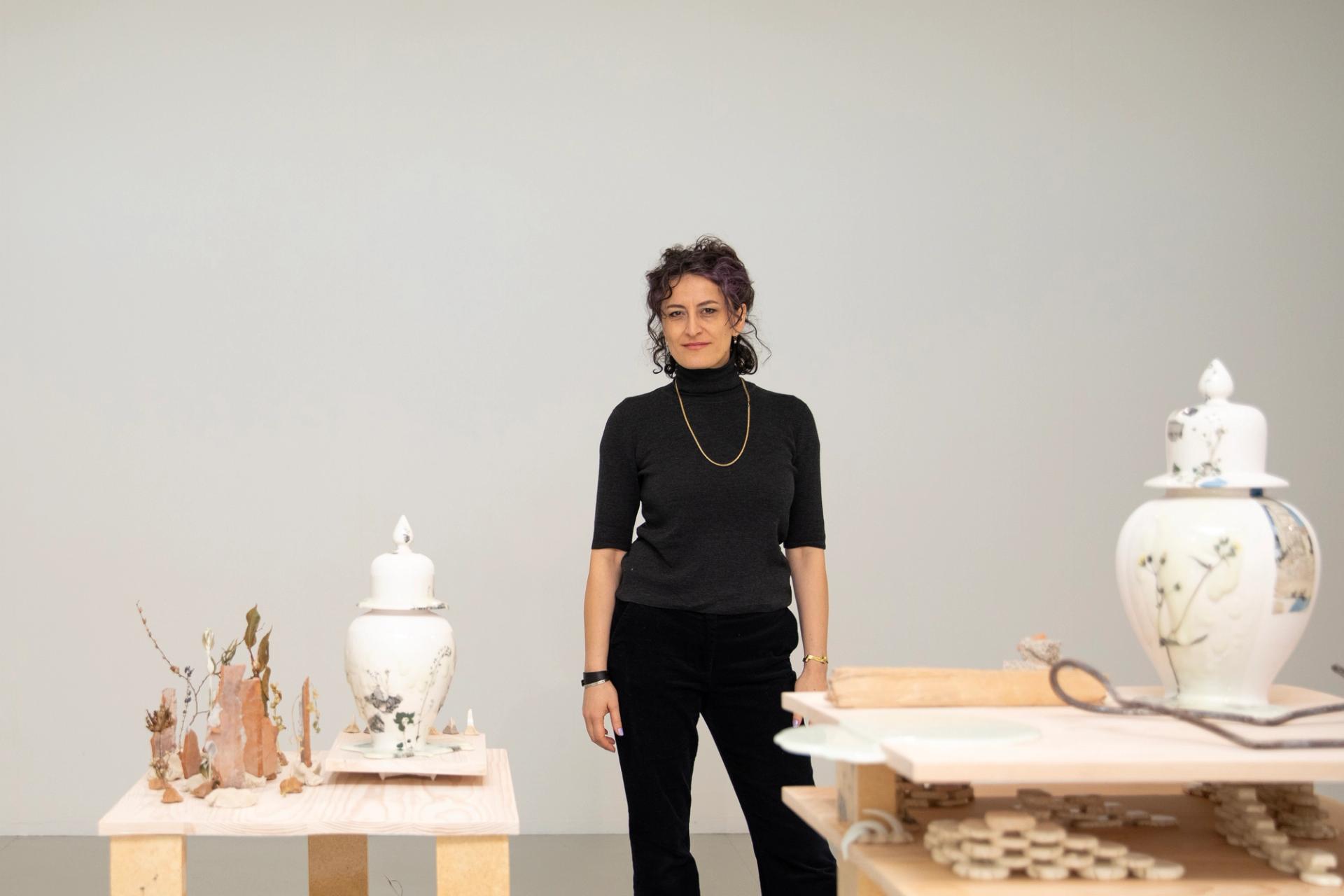 İstanbul’a döndükten sonra Galata’daki stüdyosunda yaptığıYeryüzündeki Minör Titreşimler adlı serisini ilk olarak TATE StIves’de sergiledi. Sergi için fırınlama strüktürünün bir benzerini, merkezde kümelenmiş halde yerleştirerek, galeri mekânını hayalî bir seramik fırının içiymiş gibi kurguladı. Pişirim ateşinden arındırılmış gibi görünen raflardaki Osmanlı şah vazolarının yüzeylerine güncel fotoğraflar ve flora seçkileri transfer etti. Aynı formun soyutlamaları olan geometrik formları; tasarlanmış sır bozulmaları, parçalanmalar ve yapışmalar aracılığıyla, yerleştirmede yer alan diğer buluntu nesnelerle çeşitli ilişkilere soktu. Kusurlu, kırık, eksik ya da tuhaf görünen bu seramikler, erime ve dönüşüm hallerinde katılaşmış gibiydiler. Bu sergileme izleyiciyi seramik fırınındaki pişirim sürecinin donmuş bir ânına dahil ediyor gibiydi. Yerleştirmede yer alan fotoğraflar, Ankara’da yıkılan Devlet Konservatuvarı’nın molozları arasından alınan bir parça demir, StIves çömleklerinden toplanan tuğla tozları, gölden çıkarılmış kil, dallar ve türlü atıklar gibi buluntu nesneler fırının dışındaki yaşamla güçlü politik bağlantılar kuruyordu. Reddedilemeyen kültürel miras, katılaşmış resmî tarih anlatıları, ekoloji ve kültürel belleğin korunması bakımdan sorunlu kentsel politikalar, içtenlikle deneyimlenen kültürel karşılaşmalar ve güncel yaşam deneyimlerine ilişkin yeni arayışlar fırına yüklenmişti. Sanatçı, zihninde yerleşik olan karşıtlıklar evreninin sakinleri arasında uyumlu bağlantılar kurabilme ihtimallerinin peşindeydi.