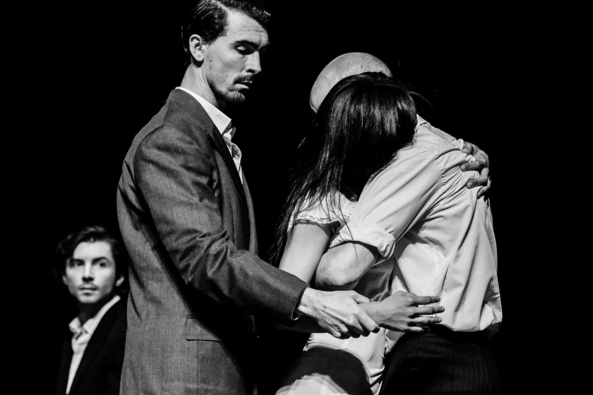 Takım elbiseli ağır ağır geri dönüyor, sabırla aynı hareketleri tekrarlıyor, kadını erkeğin kucağına yerleştiriyor, yine ağır ağır sahneden çıkarken kadın kayıp yere düşüyor. Aynı sahne, gittikçe hızlanarak tekrarlanıyor. Ta ki takım elbiseli adam tamamen yok olana ve kadınla erkek kendilerini bu yeni pozisyona sokup, kucaklaşıp düşme döngüsünü tekrar tekrar, belki onlarca defa kendi başlarına, hareketlerini belirsizleştiren bir hızda yaşamaya başlayana dek.