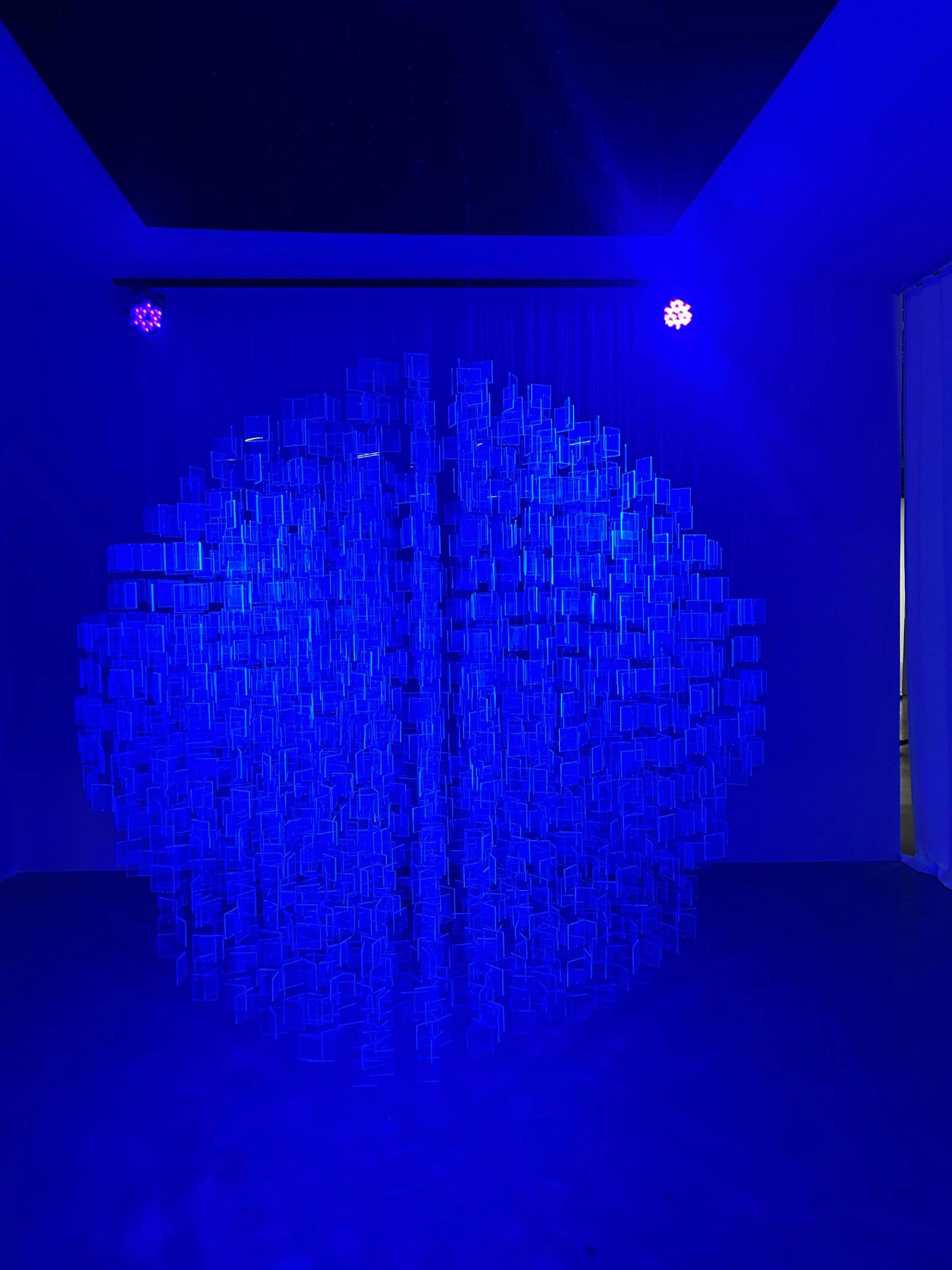 Julio Le Parc, Floresan Mavi Küre, 2016, UV yarı saydam mavi pleksiglas, ahşap