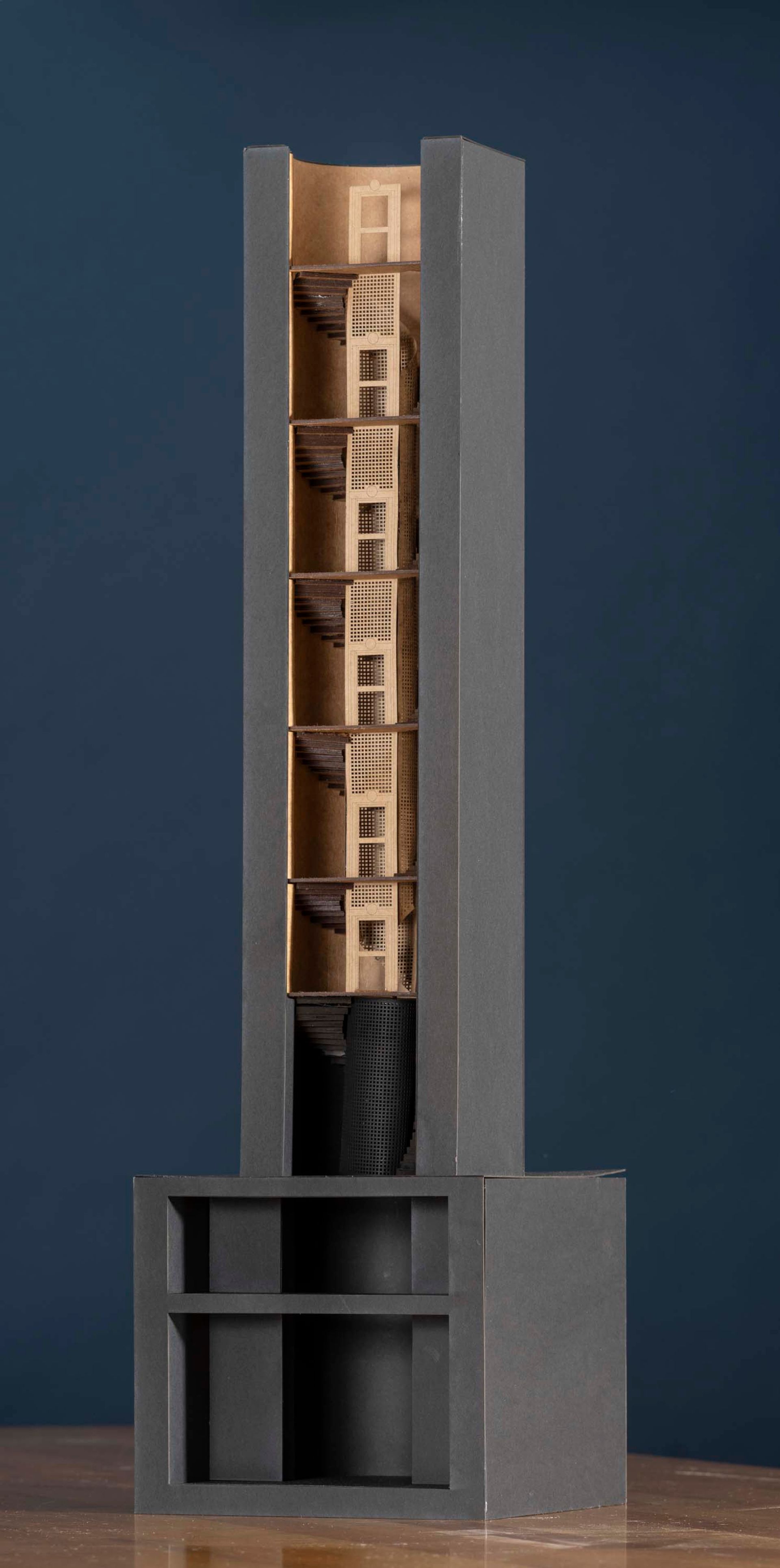 Tarihî asansörü çevreleyen merdivenden inerken her katın girişinde müzeye ait farklı bir maket karşılıyor bizi. Tam da içinde bulunduğumuz siyah bölümle etrafını çevreleyen beyaz bölümün ne anlama geldiğini sormadan edemiyorum. Sizin “kabuk ve çekirdek” olarak adlandırdığınız, hatta müzenin monografisine ad olarak tercih ettiğiniz “Bina bina içinde” bu olsa gerek değil mi?