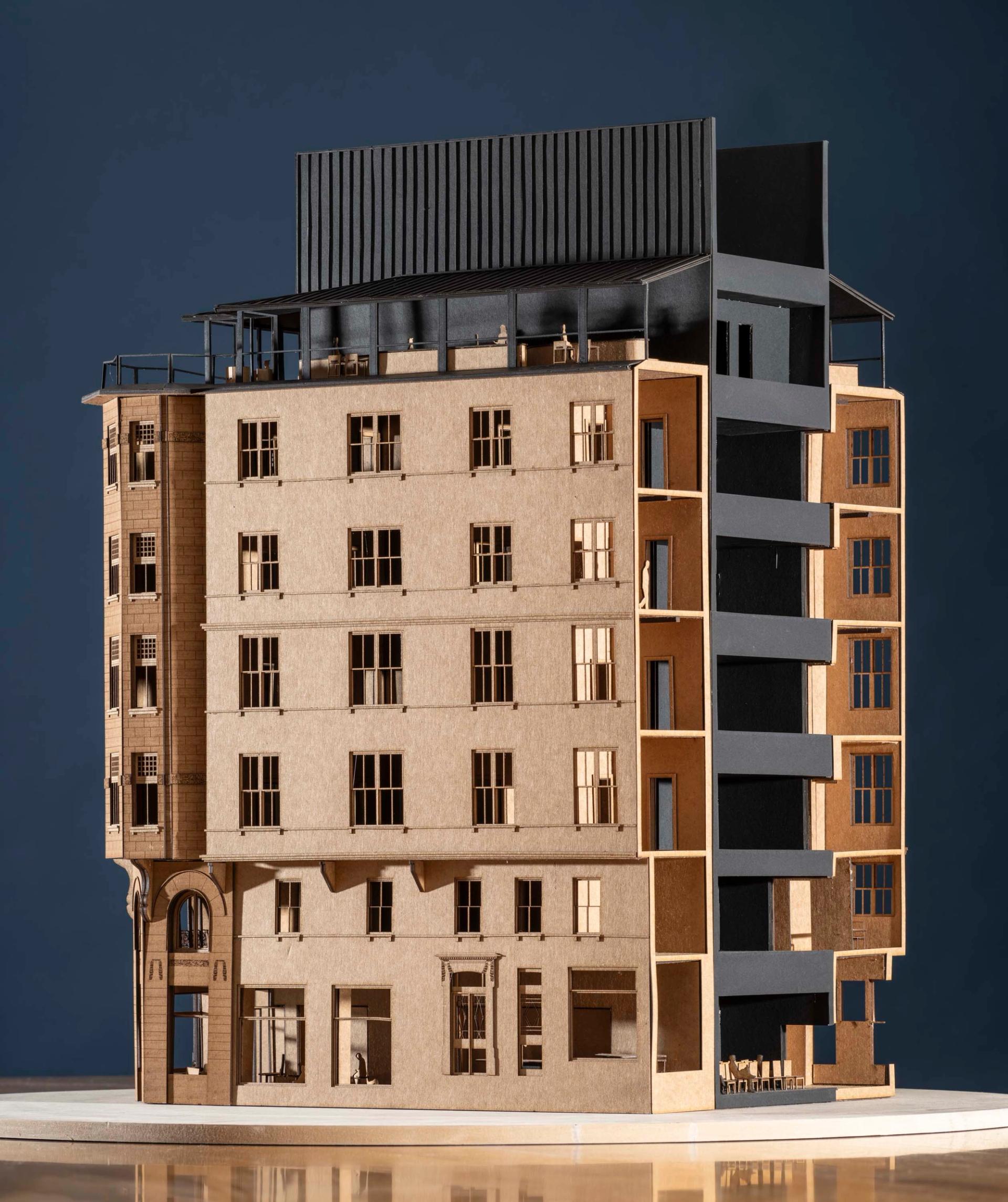 Bu bölüm dışarıdaki binanın doktoru gibi. Burayı çekersen dışarıdaki bina müze olamaz. İçerideki odalarda görmüşsündür belki, duvarlarda havalandırma delikleri var, kablo girişleri var. Her şey aslında içteki bu siyah kısımdan geliyor, diğer binanın yaşam desteği adeta, kablolarla ona bağlı. Sanki bu, mıknatısla o binayı kendine çekiyor gibi. Bu binanın cephesinde ve odalarında hiçbir güçlendirme yok, normalde 120 senelik bir yapı. Dıştaki kısmı bu içteki çekirdek taşıyor. Bu makete yukarıdan bakınca biraz ying ve yang gibi de görünüyor. İç içe geçmiş ya da kucaklaşmış gibi de duruyor.