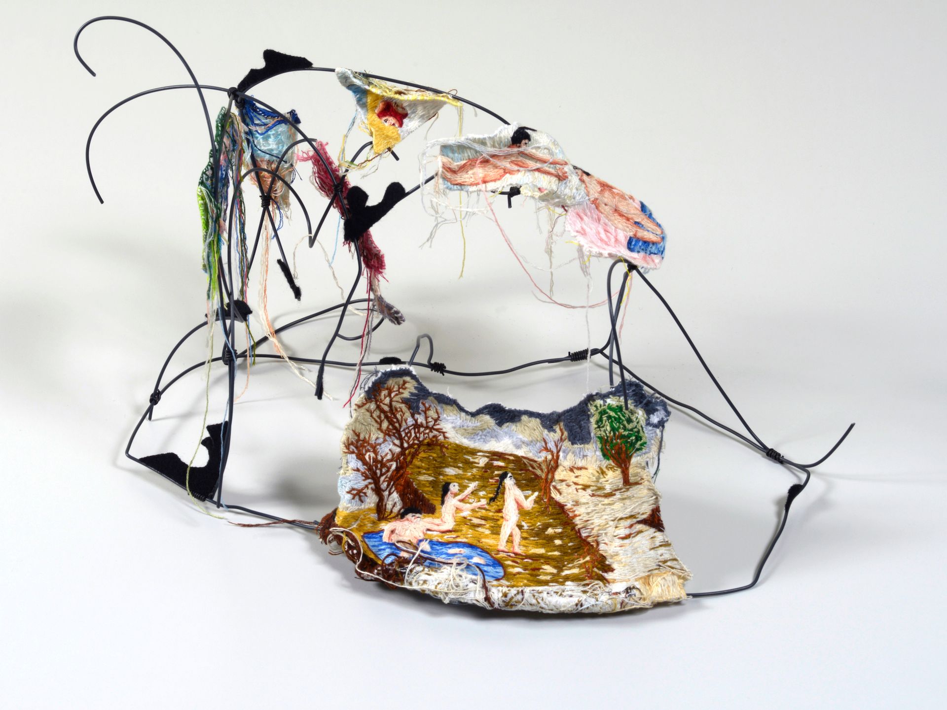 Hepsev, tel heykellere yerleştirilmiş kumaşlar üzerindeki figürleri sıkı dokumuştur. “İsimsiz”, 2023.