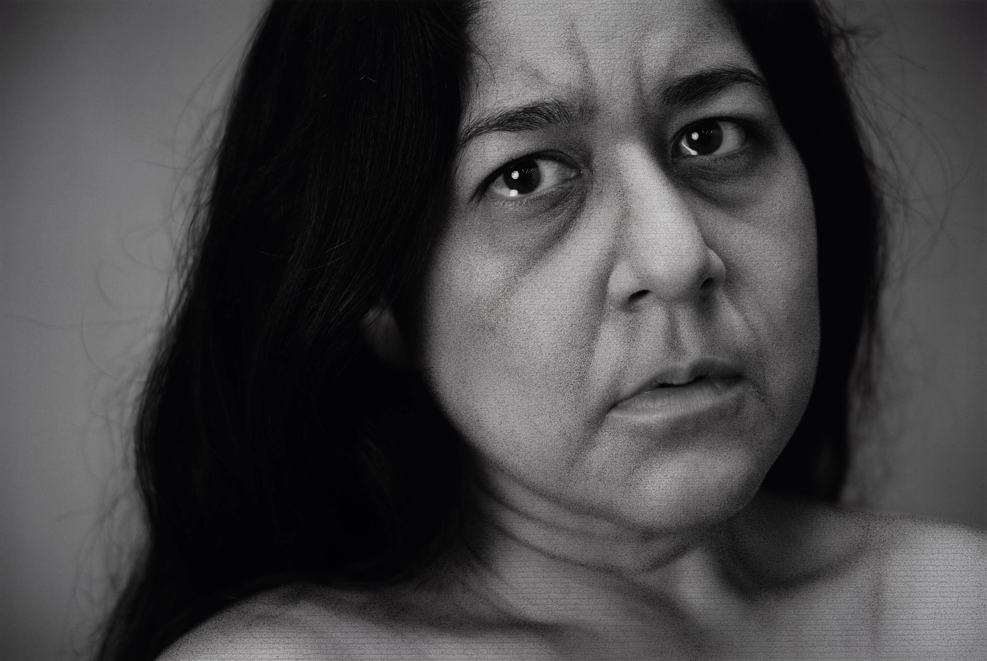 “Flavia”, 2023. “İyi bir sanat eserinin dönüştürücü olabileceğine inanıyorum,” diyor The Fury (Öfke) sergisinde şiddet mağdurlarıyla çalışan ShirinNeshat. “Ama bu kadar etkileyici bir sanat eserine ulaşmak zor.”