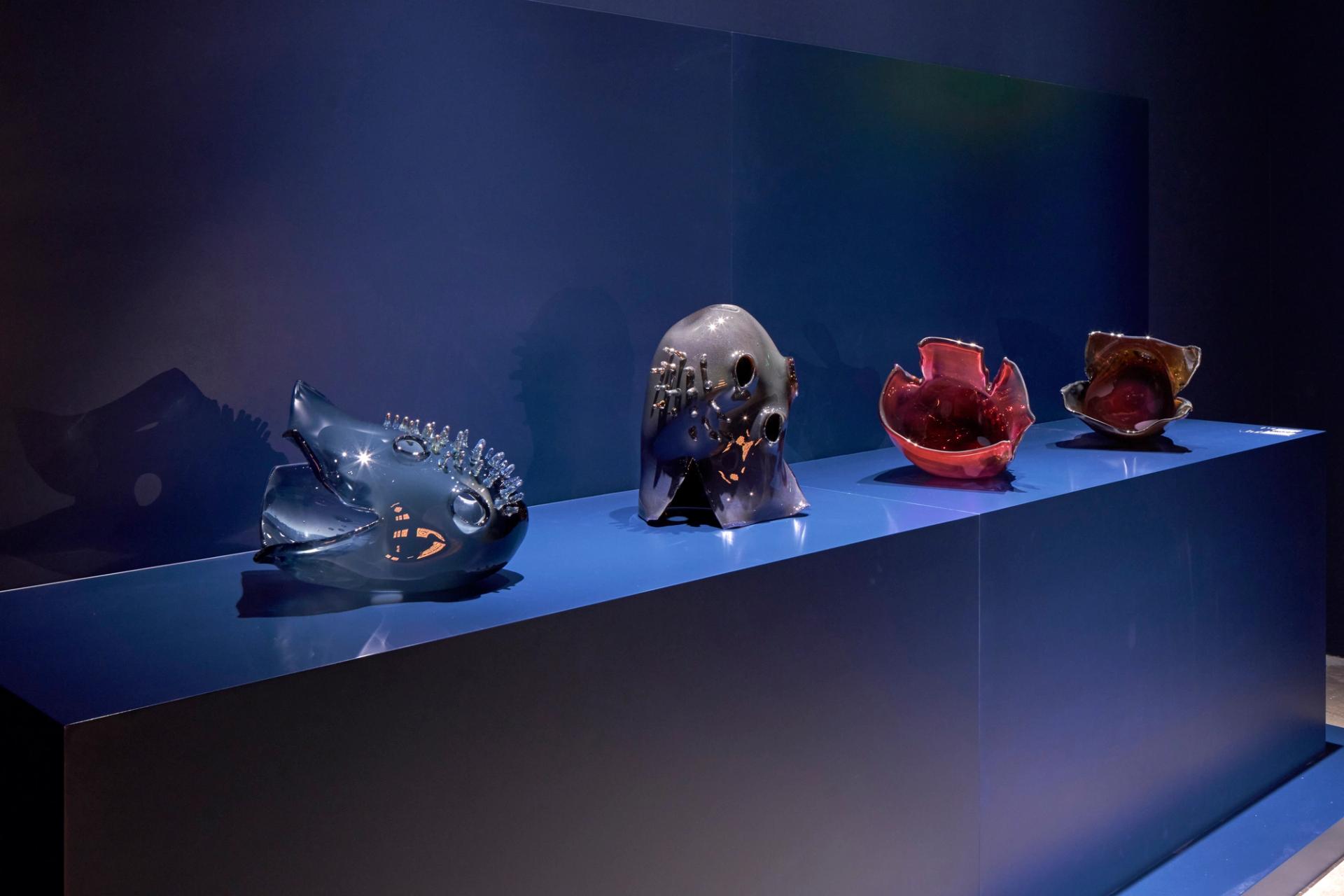 Göletin ardından ulaşılan küçük oda,lacivert duvarlarıyla tasavvuf kültüründen uzaklaştığımızı işaret ediyor. Ali Kaaf’ın burada sıralanan “Helmet” serisindeki cam heykelleri, antik zamanlardan itibaren savaşlarda kullanılan miğferlerden yola çıksa da,eski dalış kıyafetlerinin başlıklarını da andırıyor. Nitekim serginin üst katına çıkan asansörde alttan vuran ışıklarla parlayan, deniz canlılarından esinlenilmiş cam işler (T Sahki, “Whispers from the Deep”) insana kendini bir anda su altında bulmuş izlenimi veriyor.