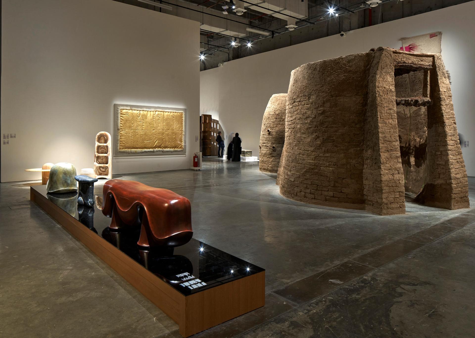 Toprak ile tasarım arasındaki diyalog, serginin giriş katı boyunca devam ediyor. İlerledikçe izleyici zanaatla,araçların icat edilmesiyle, topraktan elde edilenlerin işlenmesiyle karşılaşıyor. Geçmişle bağ kurmak isteyen tasarımcıların bölgenin coğrafyası ve kültüründen, hatta yer yer mitolojisinden beslendiğini söyleyen Beiruti, sergiyi gerçekten bölge tarihini yansıtacak şekilde kurgulamış. Hurma çekirdeklerinden (Bone, “The Introvert”) ve kilden (Salima Naji, “Sharing the Earth [Spatial Interiorities]) yapılmış “kulübe”leri, farklı farklı tekniklerle ve materyallerle dokunmuş duvar kilimlerini geçerek tasavvuf kültüründen esinlenen avizeye (Abeer Seikaly, “Constellations 2.0: Object. Light. Consciousness”) ve oradan gölete (Hiba Shahzada, “Reverie”) geliyoruz.