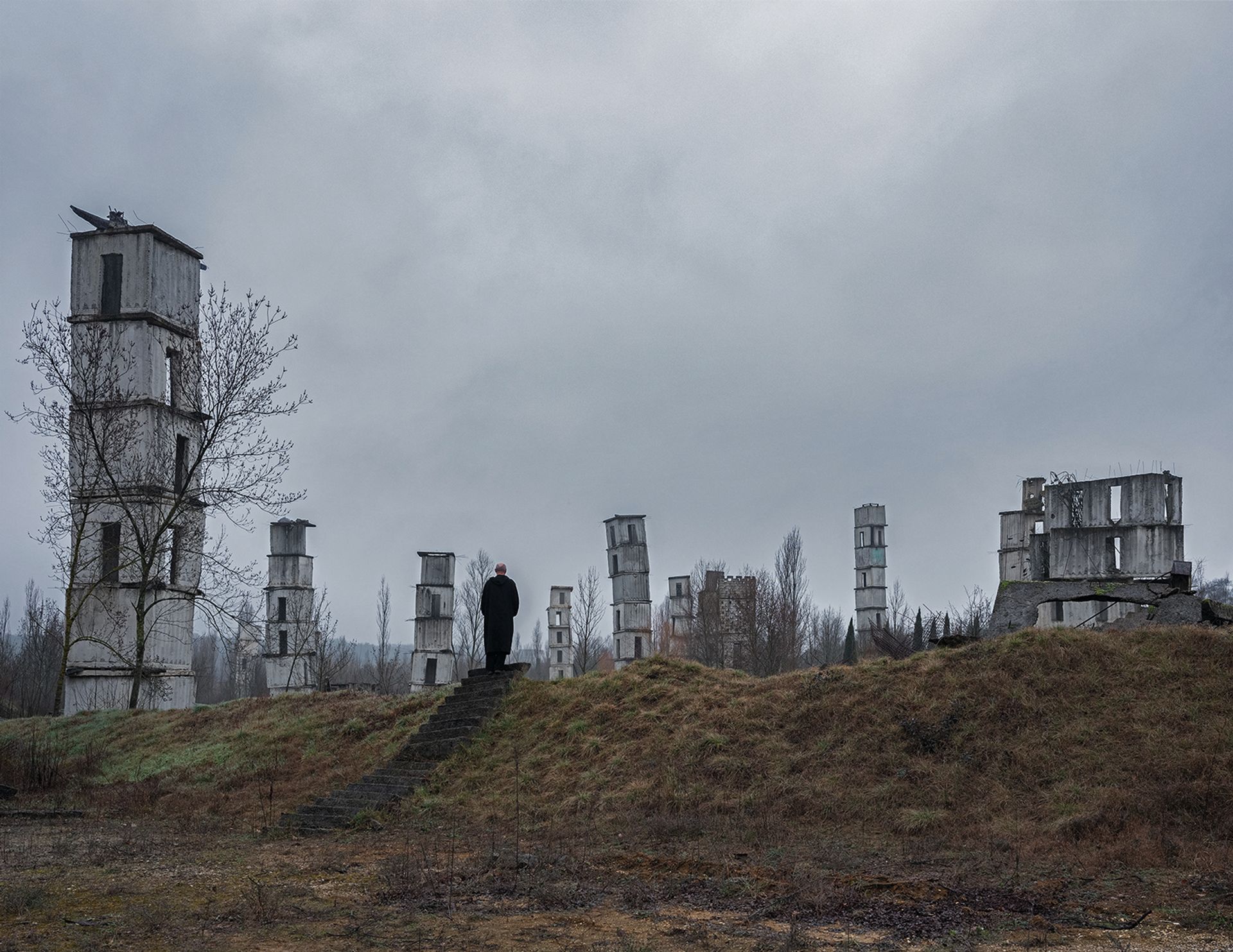 Yükseliş ve düşüş: Wim Wenders’in Anselm (2023) filminden Kiefer’in “Die Himmelspaläste” (Cennetin Sarayları, 2003-2018) enstalasyonunu sergileyen bir kare. Enstalasyon nakliye konteynerlerinin üst üste yığılmış beton dökümlerinden yapılmış bir dizi cılız kuleden oluşuyor.