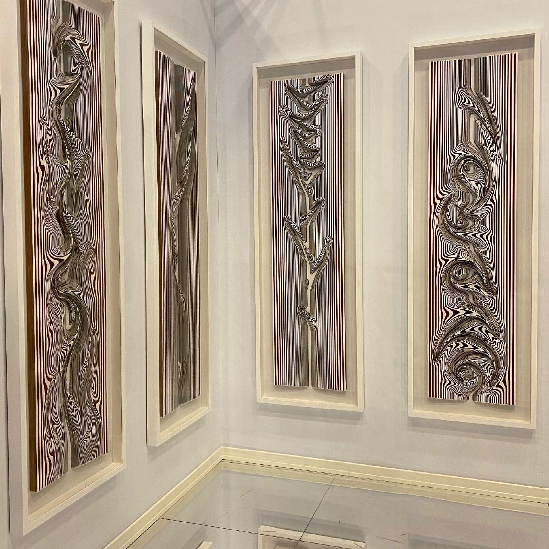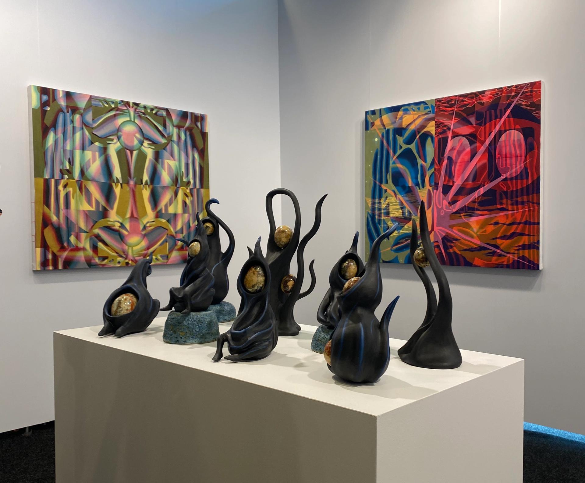 Fuarın hemen girişinde yer alan Dirimart’ın standı Seçkin Pirim’in son dönemde ürettiği 9 eserden oluşan Thorn Garden Series’i özel bir odada sergiliyor. İlhamını Mevlana’nın “birden bütüne” anlayışından alan sanatçının kendine has, iç içe ve tekrar eden formlardan oluşan eserleri, zemindeki aynayla beraber çoğalarak baş döndürücü bir deneyim sunuyor.
