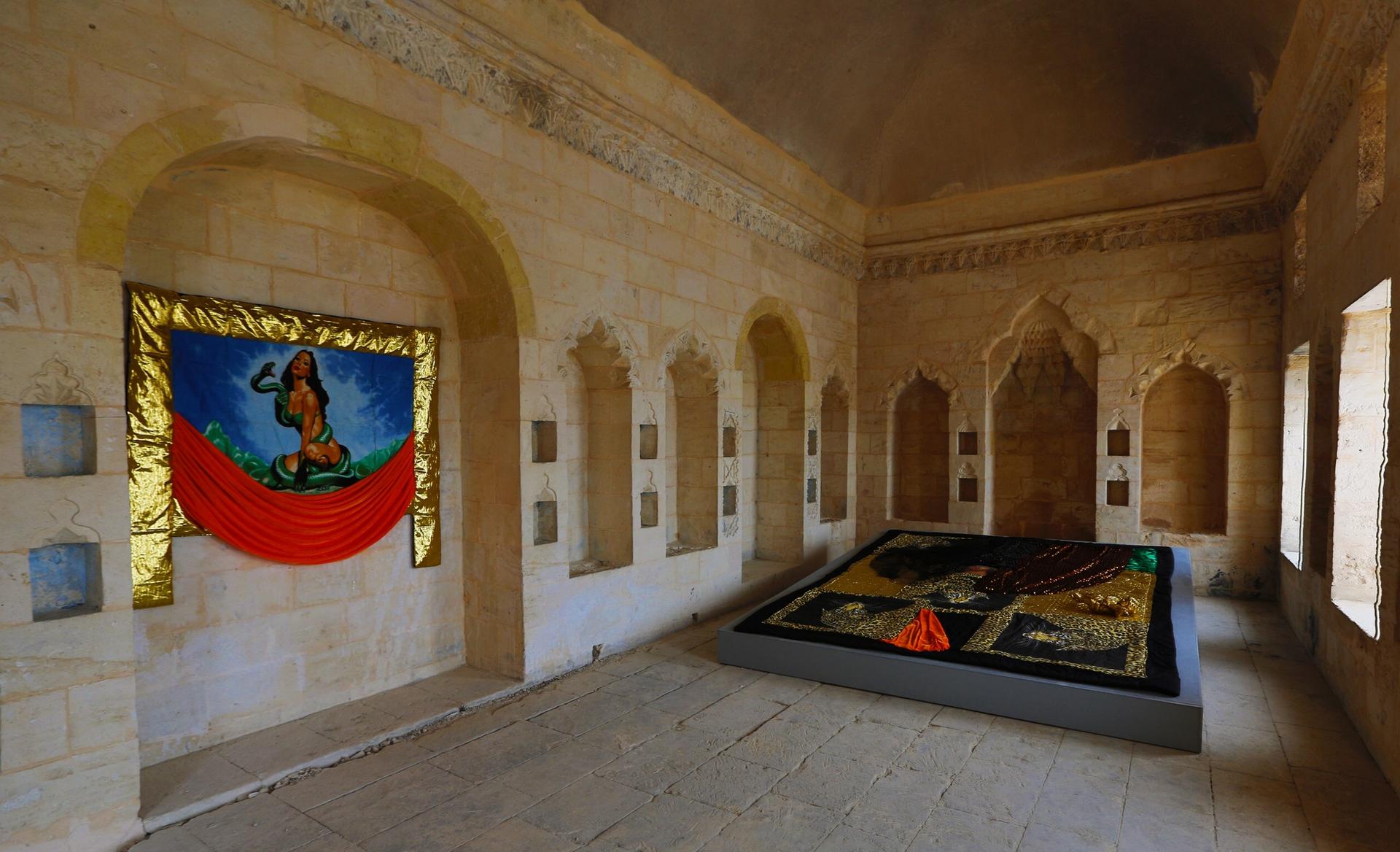 Gülsün Karamustafa, “Melankolik Şahmaran” (solda) ve “Dört Panter, İki Seccade, Bir İsa, Bebek Kemancı, Yıldızlar ve Tüller” (sağda). Karamustafa’nın 1980-2022 tarihli işleri Çimenin Vaadi temalı 5. Mardin Bienali’nde yer aldı.