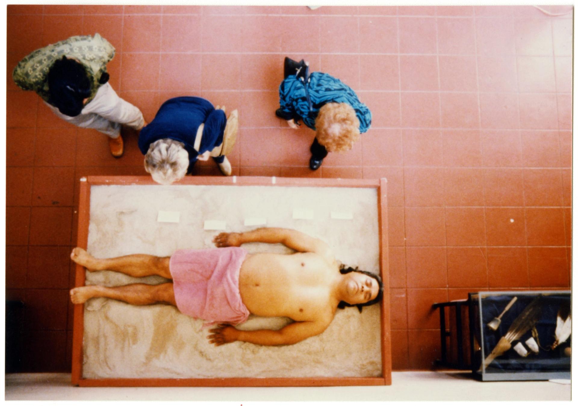 James Luna “The Artifact Piece”de (1987) of Man’in vitrinine yatarak kendi bedenini bir nesne olarak sergiledi.