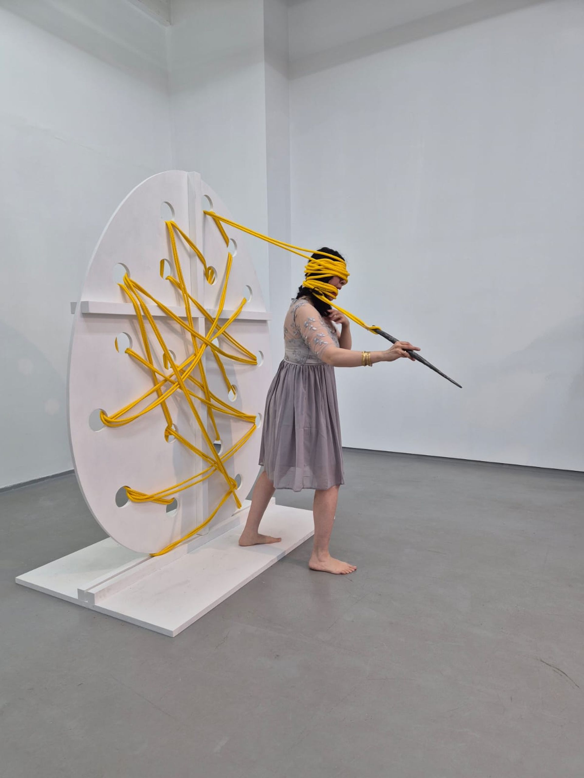 İkinci gün izlediğimiz “Cohesion Patterns-Egg”de temsili bir yumurta vardı; beyaz, oval ve ortasında asimetrik olarak açılmış delikler bulunan bir yumurta formu. Bu yumurtayı sarı bir halatla adeta dokudunuz. Halatın ucunda ağır, büyük bir iğne vardı ki iğneyi güçlükle tutmanız, yaşamın, doğumun, başlangıcın güç bir iş olduğunu da aktardı. İğnenin ağırlığını ve halatın karmaşıklığını izleyici de doğrudan deneyimledi. İnteraktif ve kolektif bir iş ortaya çıkardınız. Bu performansın interaktif oluşu nasıl bir deneyim ortaya çıkardı?