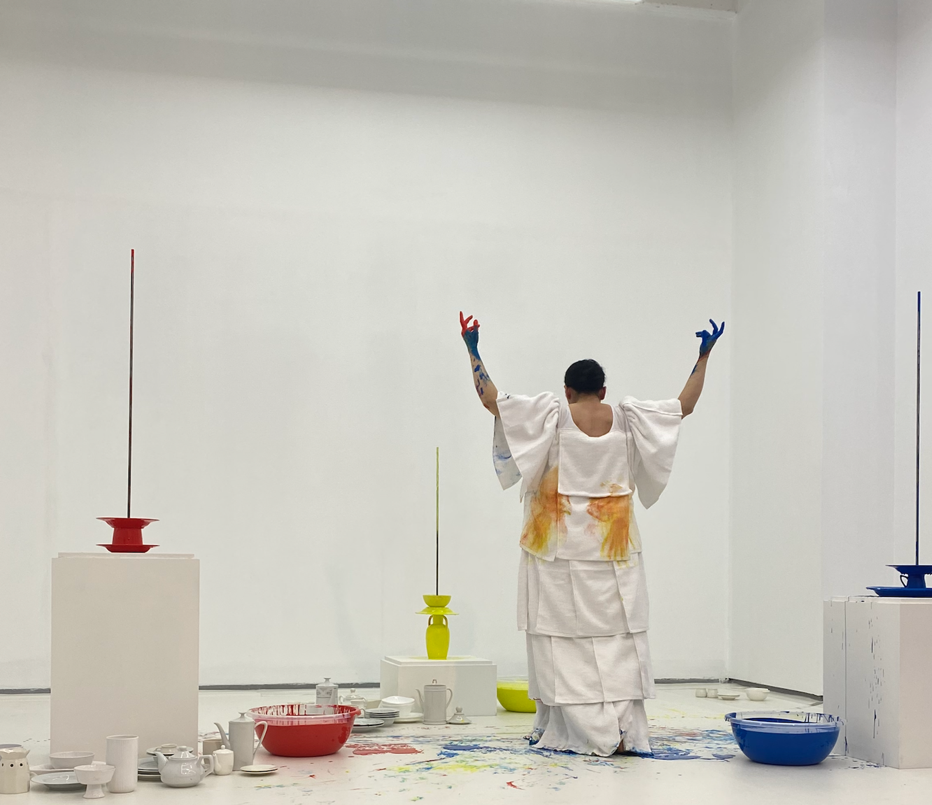 Evet çok haklısın, içinde Pollock, Duchamp, Beuys var ama bakarsan Klein da var bu işte. Niyetim bunları alıp birleştirmek değildi ama. 2021’de Bröhan Total! (Bröhan Toplamı!) adlı sergi kapsamında Berlin Bröhan Müzesi’ne davet edilmiştim. Bröhan Müzesi, art nouveau ve art deco için kurulmuş bir devlet müzesi. Sergide müzenin kurucu direktörü, koleksiyoner ve aynı zamanda müzeye adını veren Karl H. BröhanKoleksiyonu’ndan seçkiler vardı. Bana sergi kapsamında porselenle bir şey yapmak isteyip istemeyeceğimi sordular. Ben de kabul ettim. Porselen bilirsin çok değerlidir, hatta beyaz altın derler ona. Almanya’da bu performans için bulduğum porselenlerle performans Almanya tarzında oldu. Çünkü porseleni biliyorsun, coğrafi özellikler taşır. Bu işi Türkiye’de yaptığımda ise Türkiye tarzı oldu. Almanya’da daha farklı daha büyük boyutlu porselenlerle çalışırken, burada daha minimal porselenlerle çalıştım.