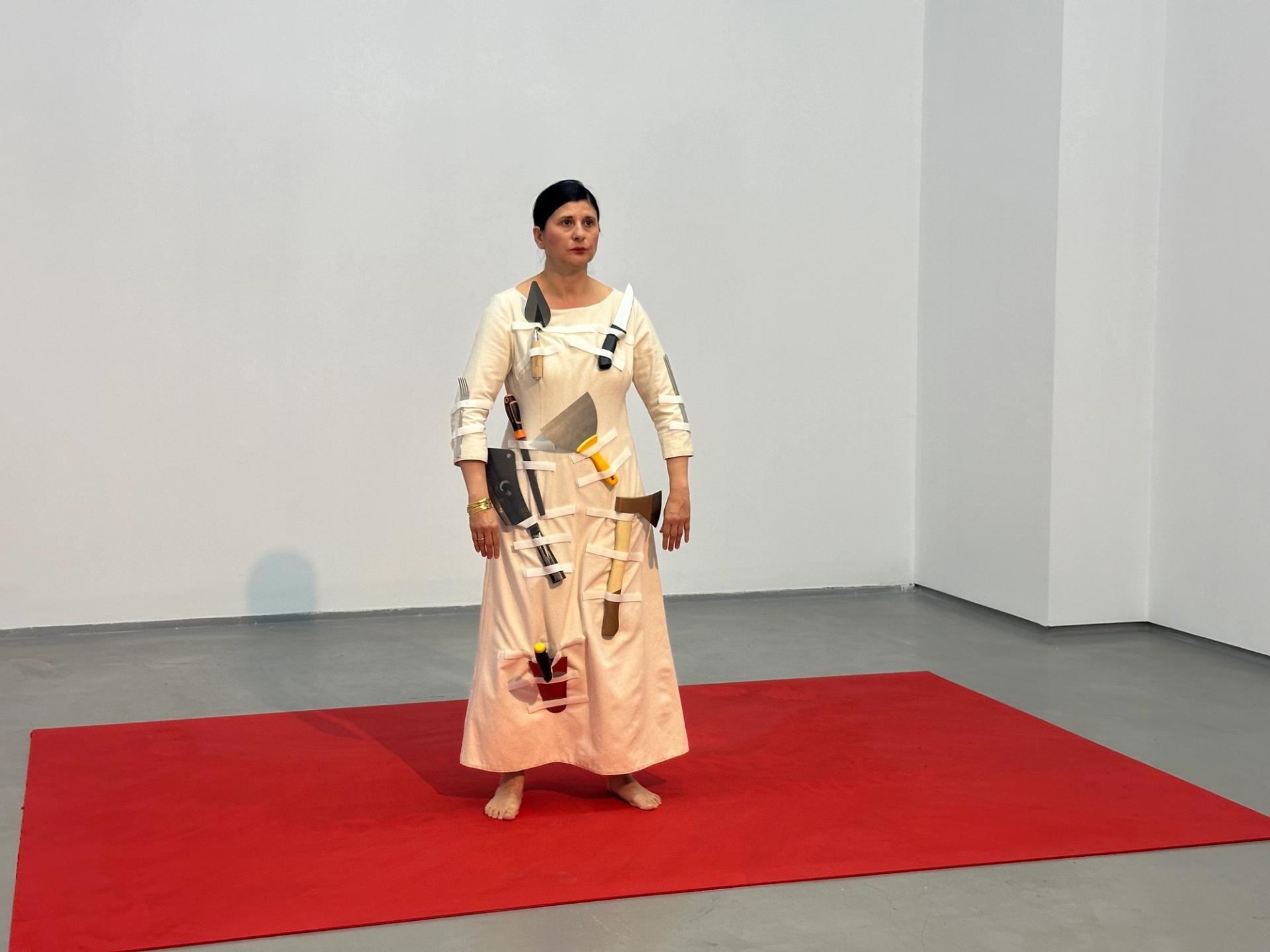Ben kostümde bakışımı oyaladım diyebilirim. Kostümünüzde monte halde duran ve performansta sırasıyla kullandığınız aletler çeşitlilik gösteriyor; bıçak, çekiç, çatal gibi. Bunlar önce giydiğiniz ten rengi, keten bir elbisenin üzerine duruyor, ki sonraki gün bu elbise de bir enstalasyon olarak sergiye katılıyor. Benim gözlemim elbiseden söktüğünüz her bir aletin başka bir mesleğe, yani başka bir öznelliğe ve hayatı yaşama tarzına gönderme yapması ve her öznellik için ortak bir ifade olarak “insanın onuruna dokunulamaz” ifadesinin yer alması. Bu çeşitlilik, ortaya adına uygarlık dediğimiz toplumsal yaşamı çıkarıyor; sanki siz buradaki özneler arası eşitsizlik ve ortak yaşama içkin söylemsel ve fiziksel şiddete dair mesafe almaya çalışıyorsunuz. Bunun bir kazıma eylemiyle gerçekleşmesi de yine toplumsal yaşama ilk geçiş ve ardından uygarlaşan insanın “vahim” durumuna işaret eder gibi.