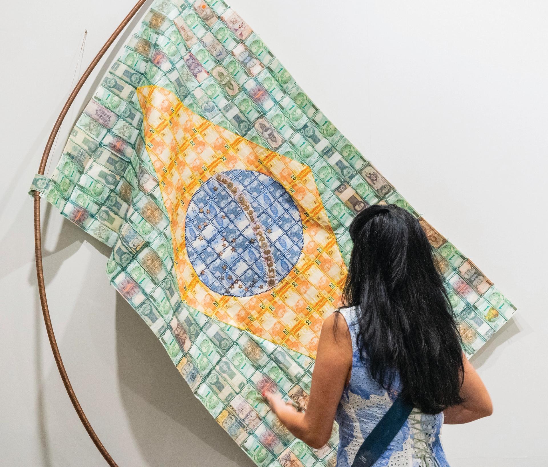 Bana parayı göster: Renkli banknotlardan yapılmış bir Brezilya bayrağını tasvir eden bir çalışma. © SP–ARTE