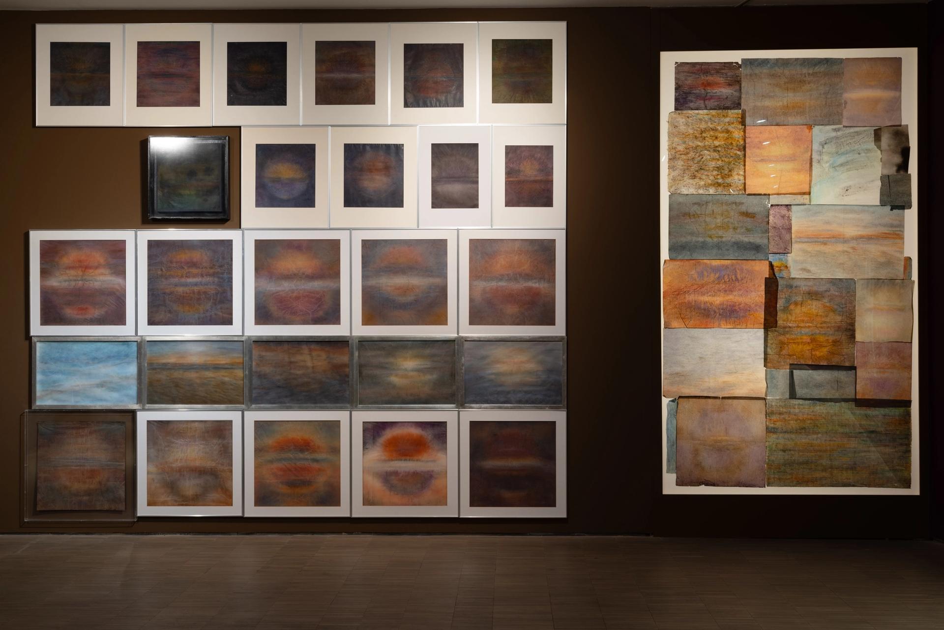 Fotoğrafta durdurduğu ânın karşısındaki duvarda ise hareketli görselleştirmeler var. Pirinç kâğıdıyla yaptığı çizimlerde iki farklı yüzey kullanarak denizkestanesi imgelerini görüyoruz. Alt yüzeyde kullandığı resim kâğıdına çizdiği deseni, üst yüzeydeki şeffaf pirinç kâğıdına eklediği renk katmanlarıyla hareketli bir görüntü yaratıyor. Bu eserlerdeki harekete iki kâğıt arasındaki üç-dört santimetrelik mesafe de doğrudan hizmet ediyor, dahası bizim hareket edişimizle birlikte etkisi katlanıyor. Kâğıdın şeffaflığıyla katmanların hissedildiği bir görüntü yakalarken (kolay yırtılabilirliği), hassaslığıyla da denizkestanesinin içeriye doğru yaşam formunu kavramsal olarak vurguluyor. Sergi kurgusundaki büyük boyutlu duvar yerleştirmesi denizin güneşle etkileşimini anımsatıyor. Güneşin doğuşu ya da batışıyla denizde değişen ve dönüşen renkler, bu duvar enstalasyonunda boyutlandırılmış olarak karşılıyor bizi.