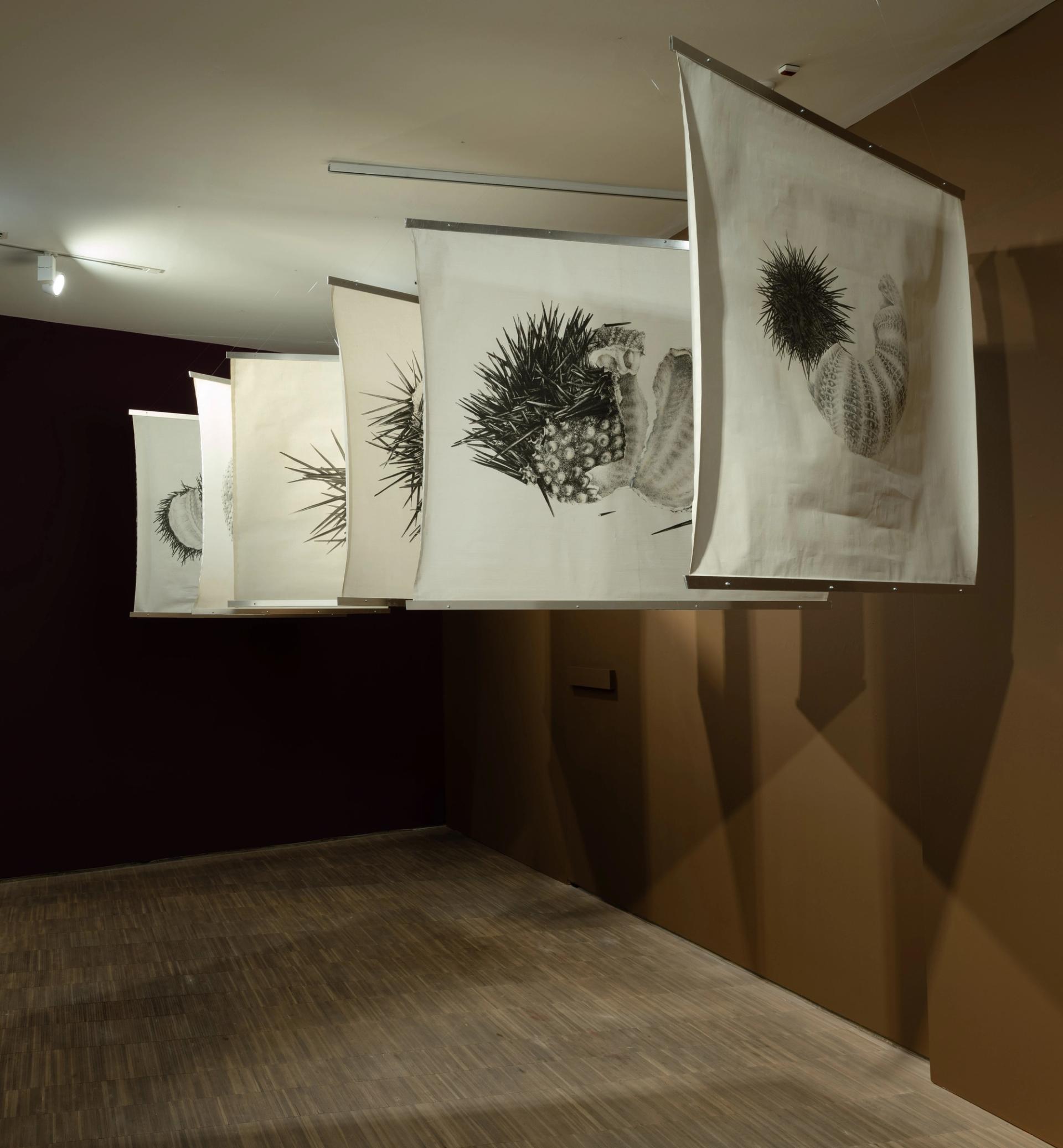Sergide seramiklerin yanı sıra denizkestanesi çizimleri de sergileniyor. Salonu bölen bu büyük duvarın diğer tarafında ise sanatçının atölyesini andıran bir oda var.
