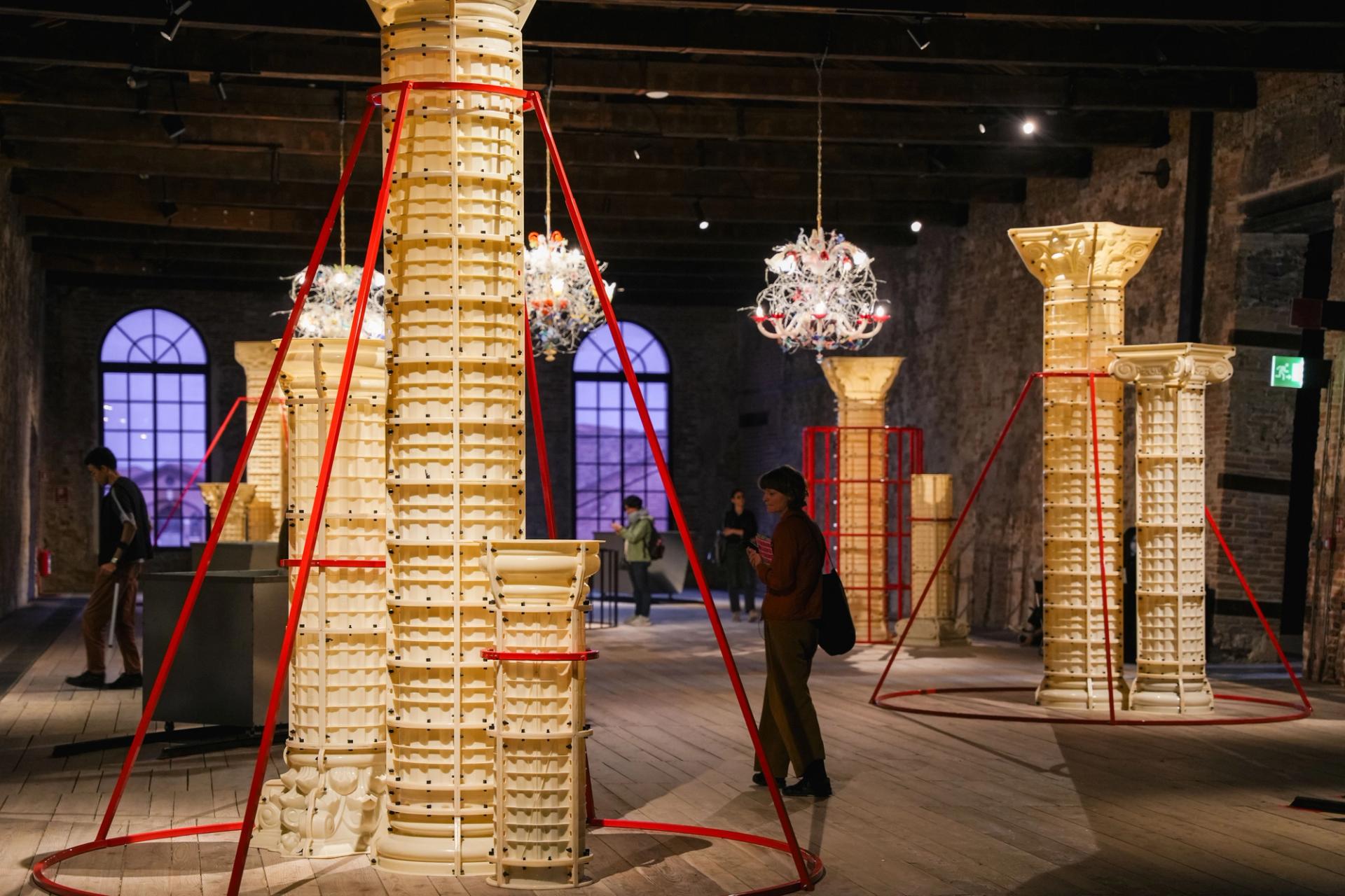 Venedik Bienali’ndeki işe gelirsek, Çin’den ithal ettiğimiz sütun kalıplarıyla –ki bu sütunlar günümüz mimarisinde süs olarak çok kullanılıyor ve bu kalıplar hep Çin’den geliyor– bunların alanında da aslında galiba o dikenli tellerle sarılmış Venedik camından bir araya getirilerek üretilmiş avizelerin içindeki küçük renkler, kıpırtılar, yer yer ışıklar, belki ileriye doğru hâlâ bir umut taşıdığımızın örneğidir.