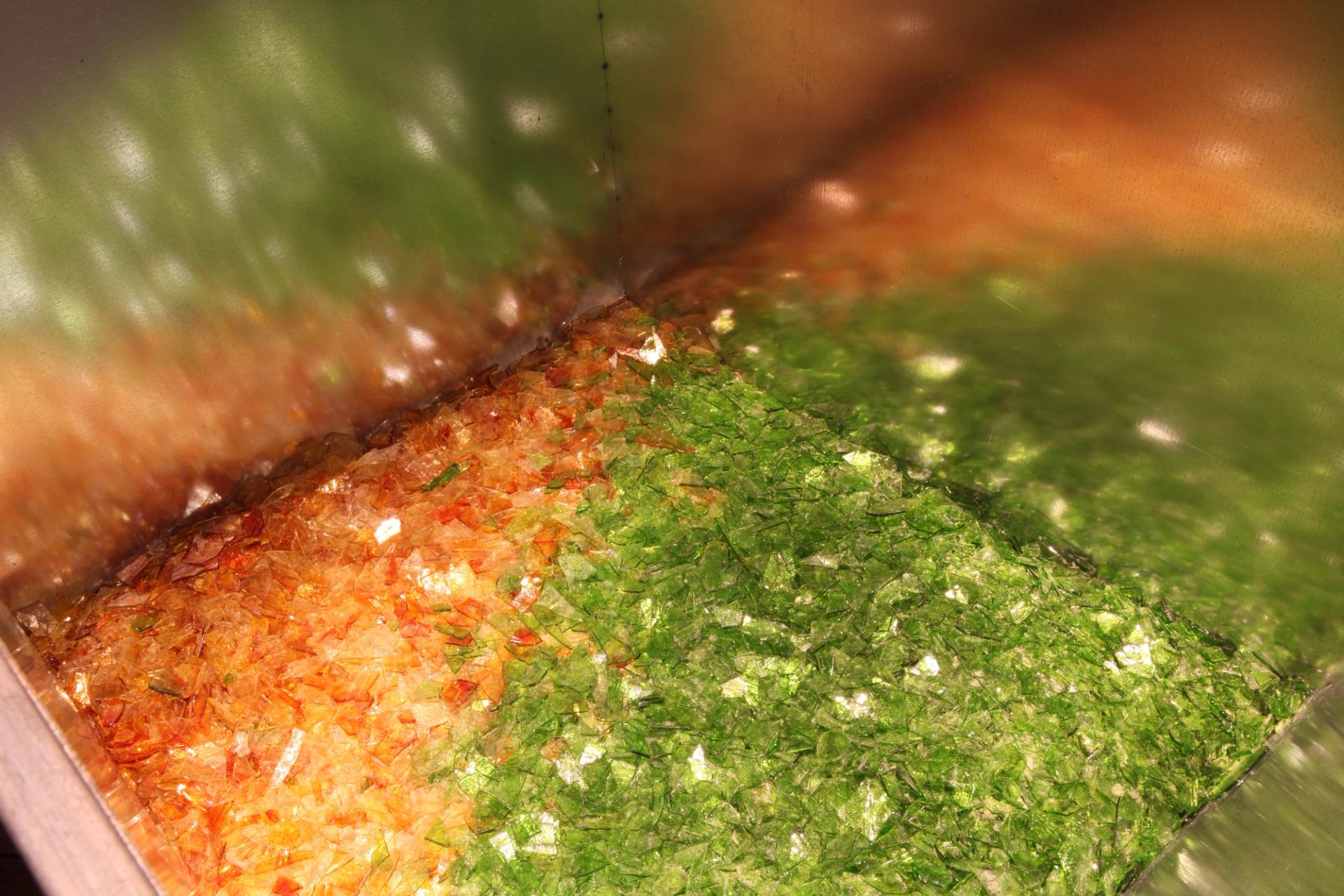 Olmaz mı… Biz cam üreticilerinin orada çalışırken birden bir şey gördüm, cam üretilirken camın fazla parçaları kesiliyor ve yerde duran konteynerlerin içine atılıyor. Ben bunu görünce çok etkilendim çünkü cam parçaları o kadar cazip, o kadar pırıltılı ki, kendimi alamadım, elimi uzattım ve etraftan bağırdılar, “Sakın, elleme, sıcaktır, keser!” Derken tabii elimi de kestim ve camların üstüne kanlar akmaya başladı. Fakat işte bu da benim malzemem, beni hayatta yönlendirdiği yer burası. Dolayısıyla onlar da bu konteynerlere benzeyen, altında hiçbir yere gitmeyen kesik rayları bulunan vagonların –vagon, konteyner dediğimiz zaman aklımıza neler neler geldiğini de düşünün– içindeki cam parçalarını da getirip mekâna koydum. Gördüğün gibi hepsi birbirine bağlı ama planlı değil, statik bir şekilde değil, her şey beni başka bir yere götürdü ve öyle oluştu tüm iş. Bu süreci de herkesle birlikte yaşadık ve en sonunda böyle bir sonuca ulaştık.