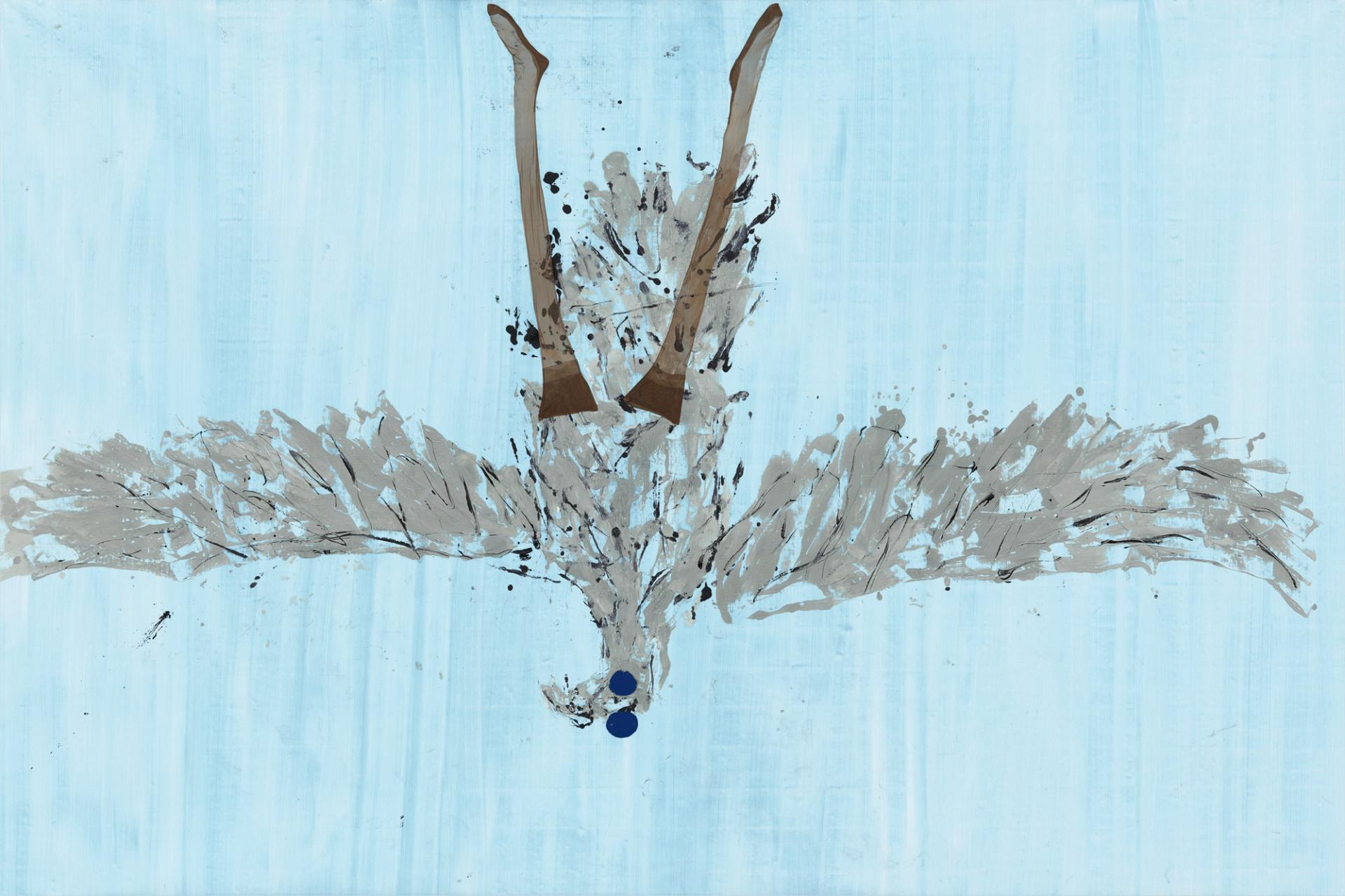 “Seks Yapamıyorum” (2024). “Ne çılgın, gerçeküstü bir fikir, bir kartala adeta bale sanatçısı gibi ince çorap giydirme fikri. Baselitz’le telefonda konuşurken ona Kuğu Gölü’nü hatırlattım, ‘Bu da Kartal Gölü gibi,’ dedim.”