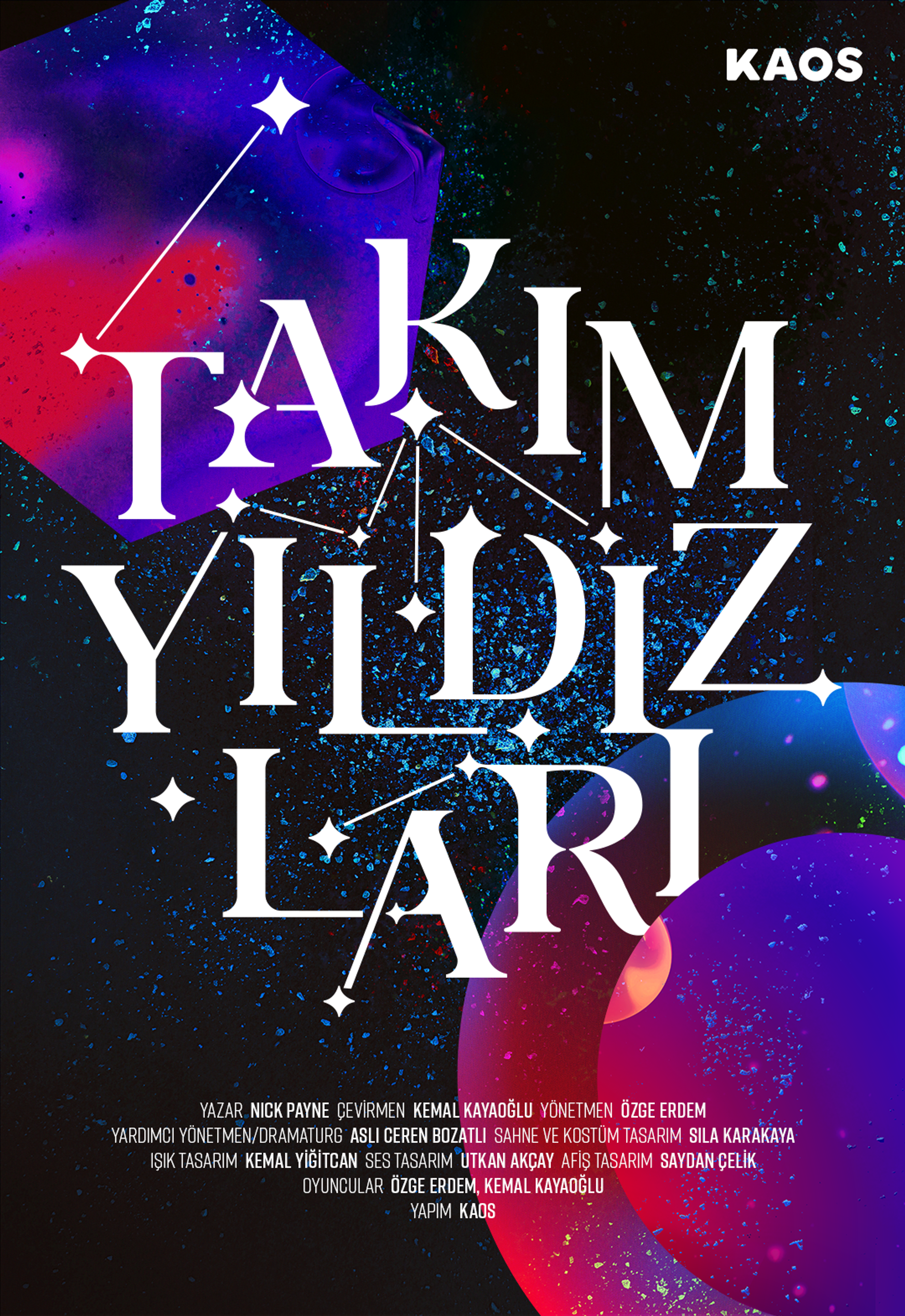 Bu etkileyici oyunu sahneye koymak üzere kurulan yeni bir ekip KAOS, üyeleri ise Özge Erdem ve Kemal Kayaoğlu. Yaklaşık 20 yıldır tiyatro yapan Özge Erdem, 2010’da başladığı profesyonel film ve dizi projelerinin ardından 2014 yılından itibaren yönetmen ve oyuncu olarak seyircinin tanıdığı bir isim. Kemal Kayaoğlu ise Berklee’de performans ve drama bölümündeki konservatuvar eğitimini tamamladıktan sonra 2015’te “Yoldan Çıkan Oyun” ve “Damdaki Kemancı” müzikalinde rol aldı. KAOS’u ise Takımyıldızları'nı sahnelemek üzere Erdem ile birlikte kuran Kayaoğlu, oyunu okur okumaz çevirmek istemiş. Oyunun sahneleme haklarını aldıktan sonra bir araya gelen ikili sahnedeki performanslarıyla göz dolduruyor. Bazı sahnelerin defalarca tekrarlanması, ihtimallerin ve beraberinde duyguların da değişmesiyle oyuncu açısından olduğu kadar izleyicisi açısından da zor bir oyun Takımyıldızları. Üstelik oyunun içinde sıkça gezinen; çoklu evren teorisi, kuantum fiziği gibi bilimsel ve zorlayıcı konuların da oyunla dengeli bir şekilde uyumlandığını da görüyoruz. Erdem ve Kayaoğlu ile hem KAOS hem ilk oyunları vesilesiyle bir araya geldik.