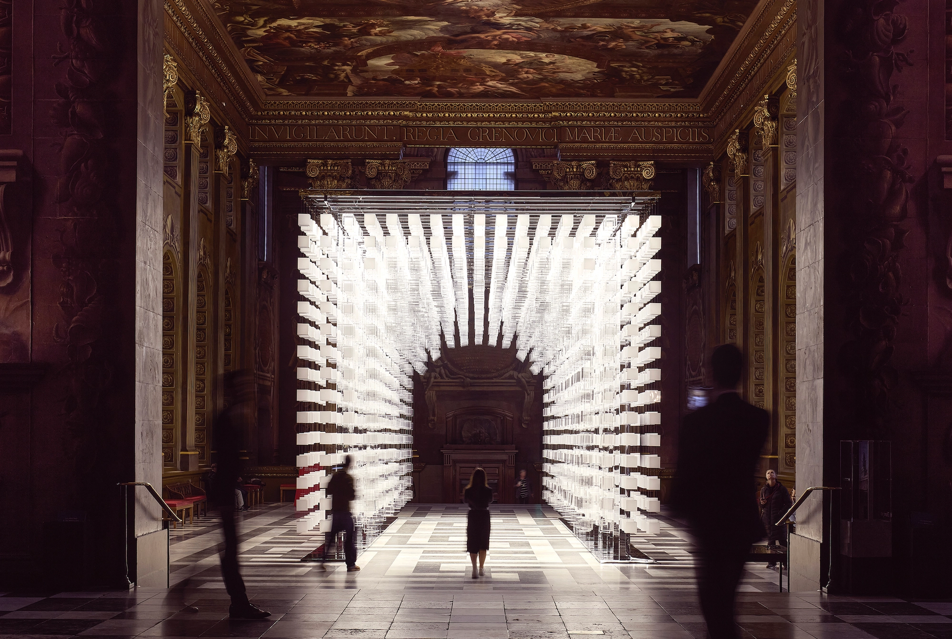 ELİF ONAY: Eseri, 18. yüzyılda Sir James Thornhill tarafından tasarlanan Painted Hall'da sergileneceğini öğrenmeden önce tasarladığınızdan bahsettiniz. Burası aklınızdaki mekânla ne derece yakınlık ya da farklılık gösterdi? 300 yıl önceden kalan Painted Hall'la "mekân içinde mekân yarattığını" söylediğiniz eseriniz nasıl etkileşime geçti?