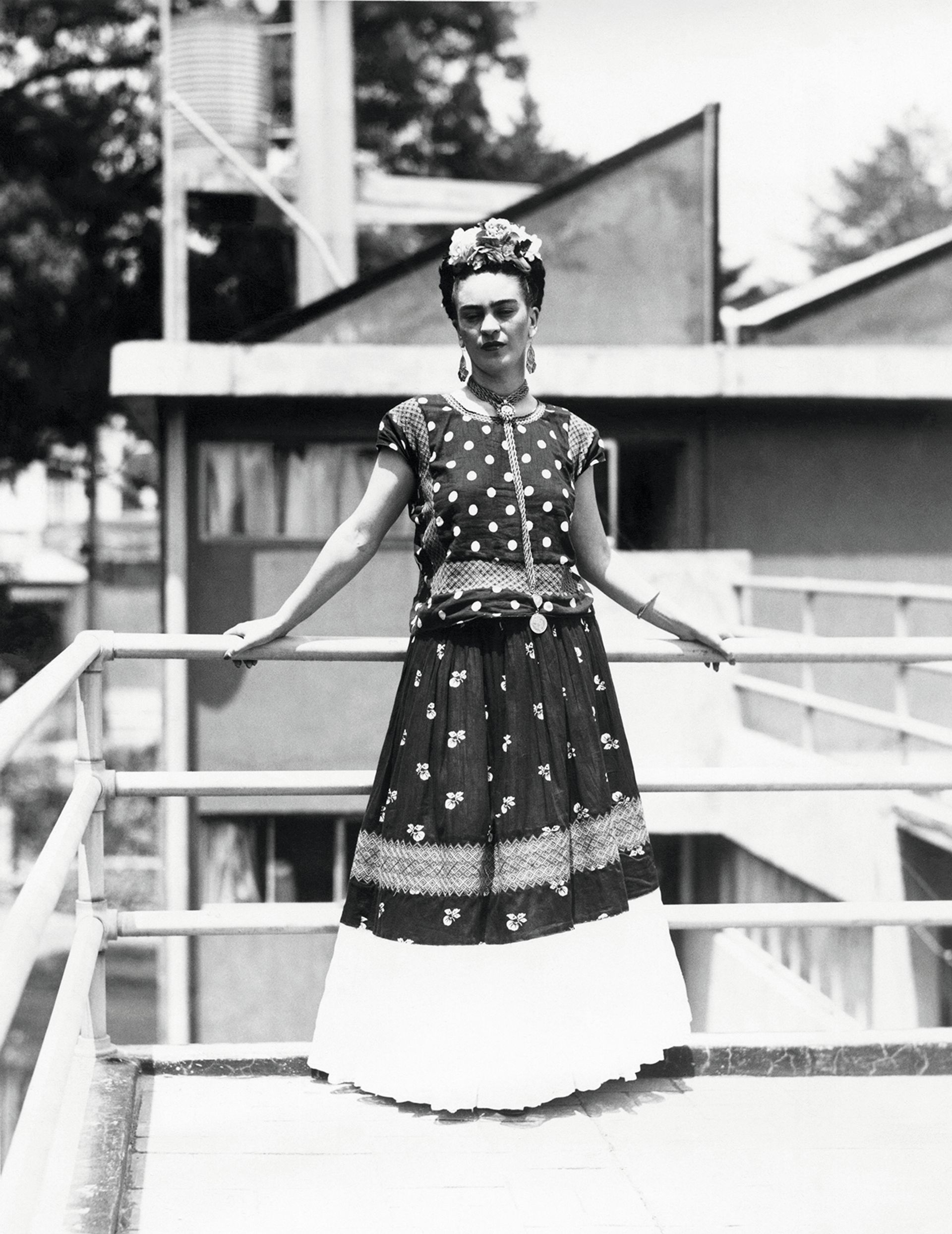Saçlarını arkadan toplayıp üç parçalı erkek takımı giyerek o dönemde halen tartışmalı olan çift cinsiyetli görünümüyle katıldığı 1927 tarihli aile fotoğrafı düşünüldüğünde, Frida Kahlo’nun kıyafetlerin ardındaki göstergebilimle ilgilenmesi şaşırtıcı olmasa gerek. Sanatçı hayatının büyük kısmında Meksika ve Guatemala’dan temin ettiği yerel kıyafetleri tercih etti; Rebozo’ları (şal), kare kesimli huipil bluzları ve el yapımı dantelle süslenmiş geniş enagua etekleri Meksika’nın anaerkil Tehuantepec halkına saygı duruşu niteliğindeydi. Kahlo kıyafetleriyle kimliğini ifade ediyor, siyasi görüşlerini yansıtıyor, engellerini güzelleştiriyordu. Tıpkı tuval üzerinde kullandığı boyalar gibi kıyafetlerini de bir şaheser yaratmak için kullandı; bu şaheser ta kendisiydi.