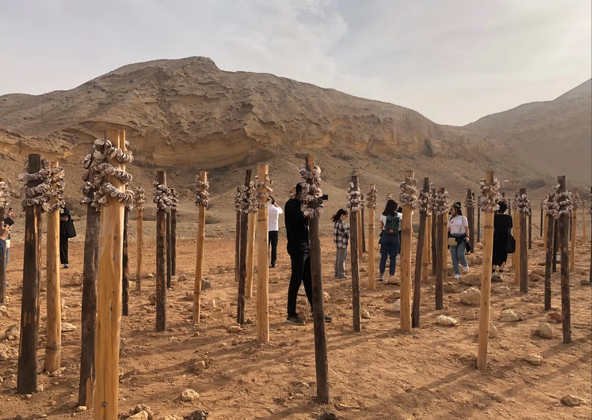Al Qasimi'nin “dünyanın bizden daha az şanslı insanların yaşadığı diğer tüm bölgelerine” yönelik açık uçlu selamlaması, elbette oldukça büyük bir anlam taşıyor. Katılımcıların geçmişlerine yapılan sürekli atıflar arasında, kaçınılmaz olarak eksiklikler olacaktır (örneğin, Uygur perspektiflerinin dahil edilmediğini gördüm). Benzer şekilde, bienalin küresel jeopolitik bağlamda keskin bir şekilde konumlandırıldığı bir ortamda, 7 Ekim'den bu yana dünyanın dört bir yanındaki Yahudi topluluklarının yükselen antisemitizmden nasıl etkilendiği göz ardı edilmiş gibi görünüyor.