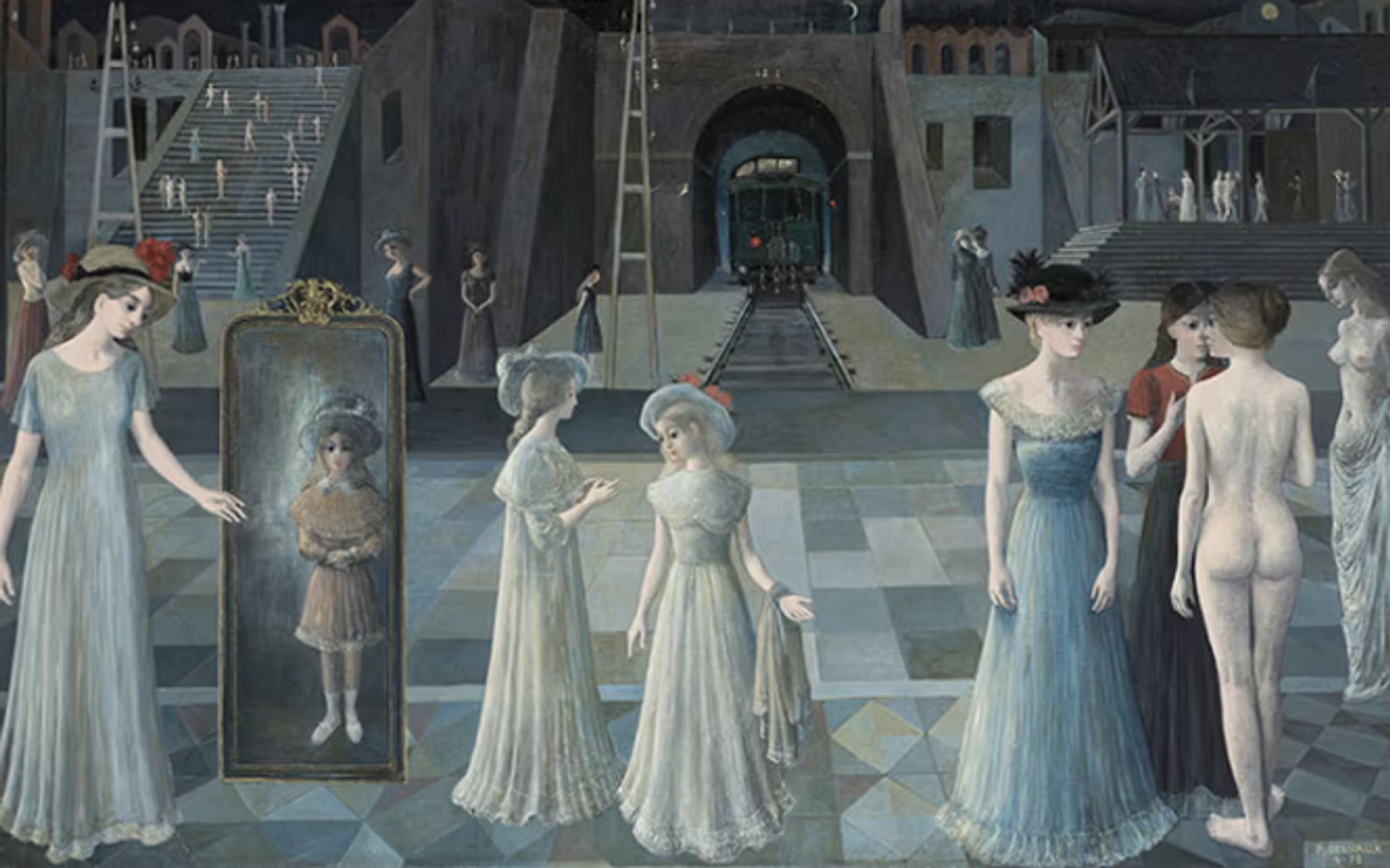 Belçikalı ressam Paul Delvaux (1897-1994), 1934 yılında René Magritte ve Giorgio de Chirico'nun eserleriyle karşılaştıktan sonra yeni bir sürrealist yöne daldı ve bir daha asla arkasına bakmadı. Her ne kadar resmi sürrealist çevreden ve Sigmund Freud'un psikanalitik fikirlerinden uzak durmuş olsa da, Delvaux'nun kadınlar, iskeletler, klasik mimari ve modern trenlerden oluşan tekinsiz alacakaranlık sahneleri, bilinçaltının gizemlerini görünür kılmaya çalışan bir akımın tüm özelliklerini taşıyor.