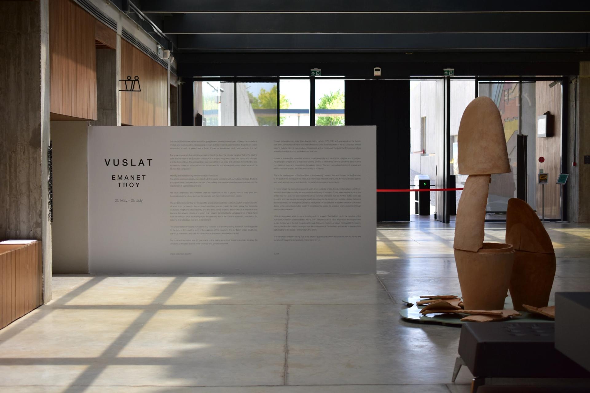 Müzenin girişinde, Vuslat’ın Yaşamın Göbek Bağı adlı heykeli bizi karşılıyor. Önceki sergide, Tophane-i Amire’deki sergi mekanının merkezine kurularak diğer işlerle doğrudan bir diyalog kuran bu eser, Troya’da açık havaya taşınarak rüzgârla birlikte devinim kazanan, kinetik ve anıtsal bir figüre dönüşüyor. Serginin odak noktalarıyla birlikte eserler arası ilişkiler de yeni bir sistem içinde yeniden şekilleniyor.