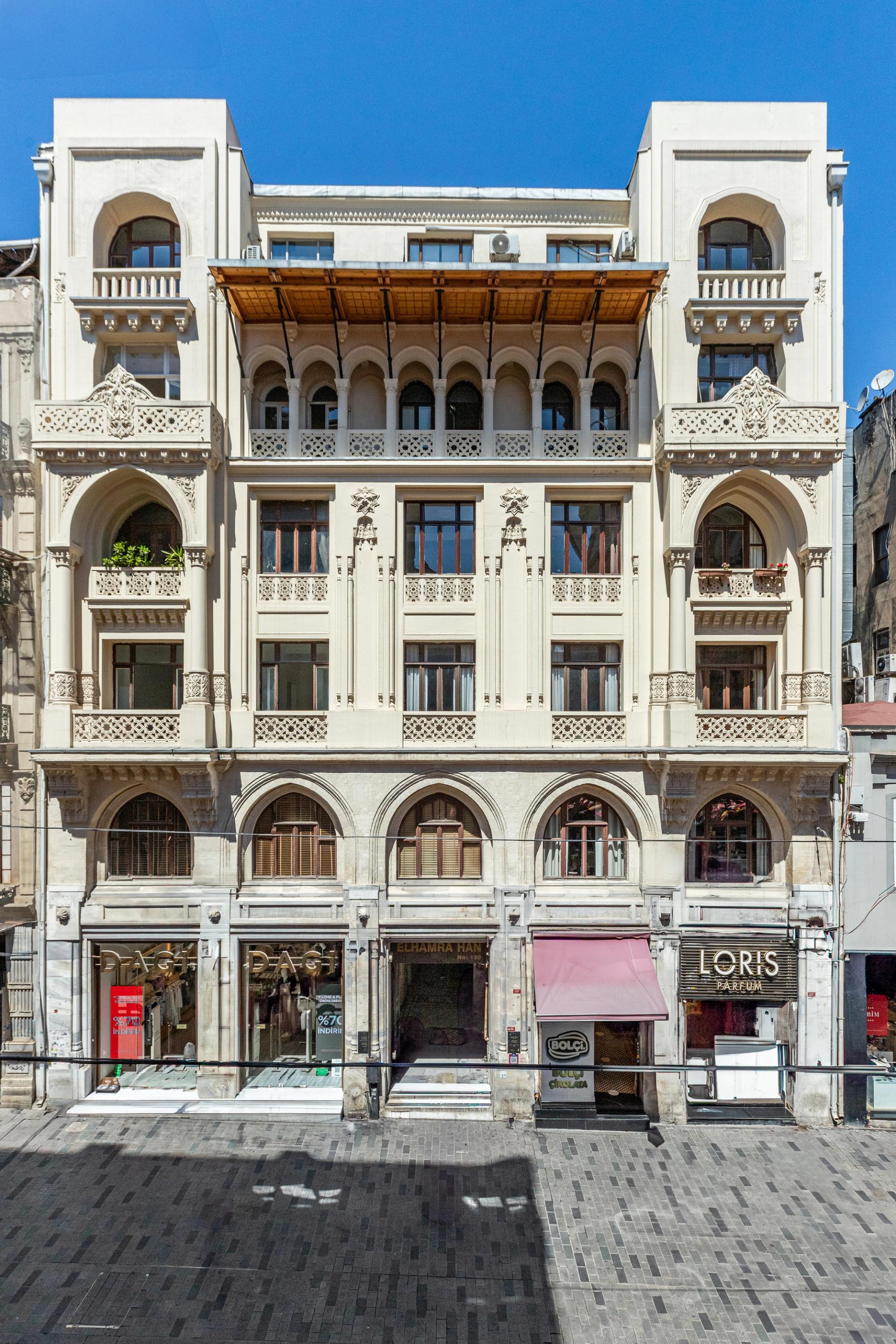 En kolay tarif şöyle: St. Antuan kilisesinin karşısındaki bina. İsmiyle müsemma. Bu sıradaki yapılar arasında hangisinin Elhamra olduğunu bulmak, İspanya’nın Granada şehrindeki meşhur Endülüs Sarayı’nı bilenler için pek kolay. İki yapı, St. Antuan ve Elhamra birbirlerini aynalıyor gibiler. Meçhul mimarı bu yapıyı, İtalyan mimar Mongeri’nin kilisenin önüne kurduğu cadde cephesine zarif bir cevap olarak tasarlamış. Benzer yükseklik ve formda sivri kemerler, en üst kata taşınan arkadlı balkon, mukarnas başlıklı sütunlar, yıldız motifleri ve girift bezemeler bir yandan kendi içinde bir dönem örneği oluştururken, öte yandan kilisenin cadde cephesiyle bir diyalog kuruyor. Geçirdiği yangın sonrası hayatımızda olmayan tiyatro kapısıyla biten pasajdan üst katlara karşılıklı merdivenlerle çıkılıyor. Blok mermer basamakları, çini döşemeleri ve tellenmiş asansörüyle tipik bir Beyoğlu binası burası. Sergiler ilk kattaki karşılıklı iki dairede yer alıyor. Vakit ayırıp merdiven altındaki çay ocağının ahşap taburelerine tünemek ve bir kahve içmek şart.