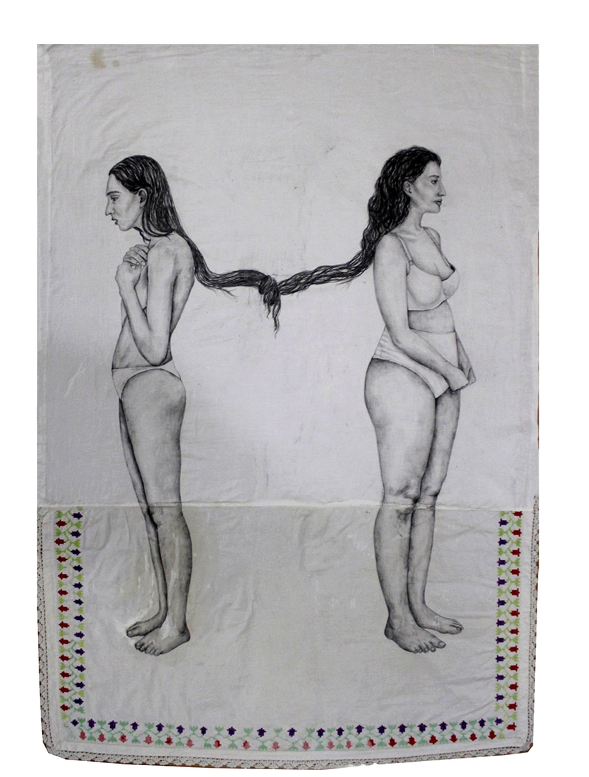 Rabia Kalyoncuoğlu, İsimsiz, 2018, nakışlı kumaş üzerine karakalem, 105/150 cm